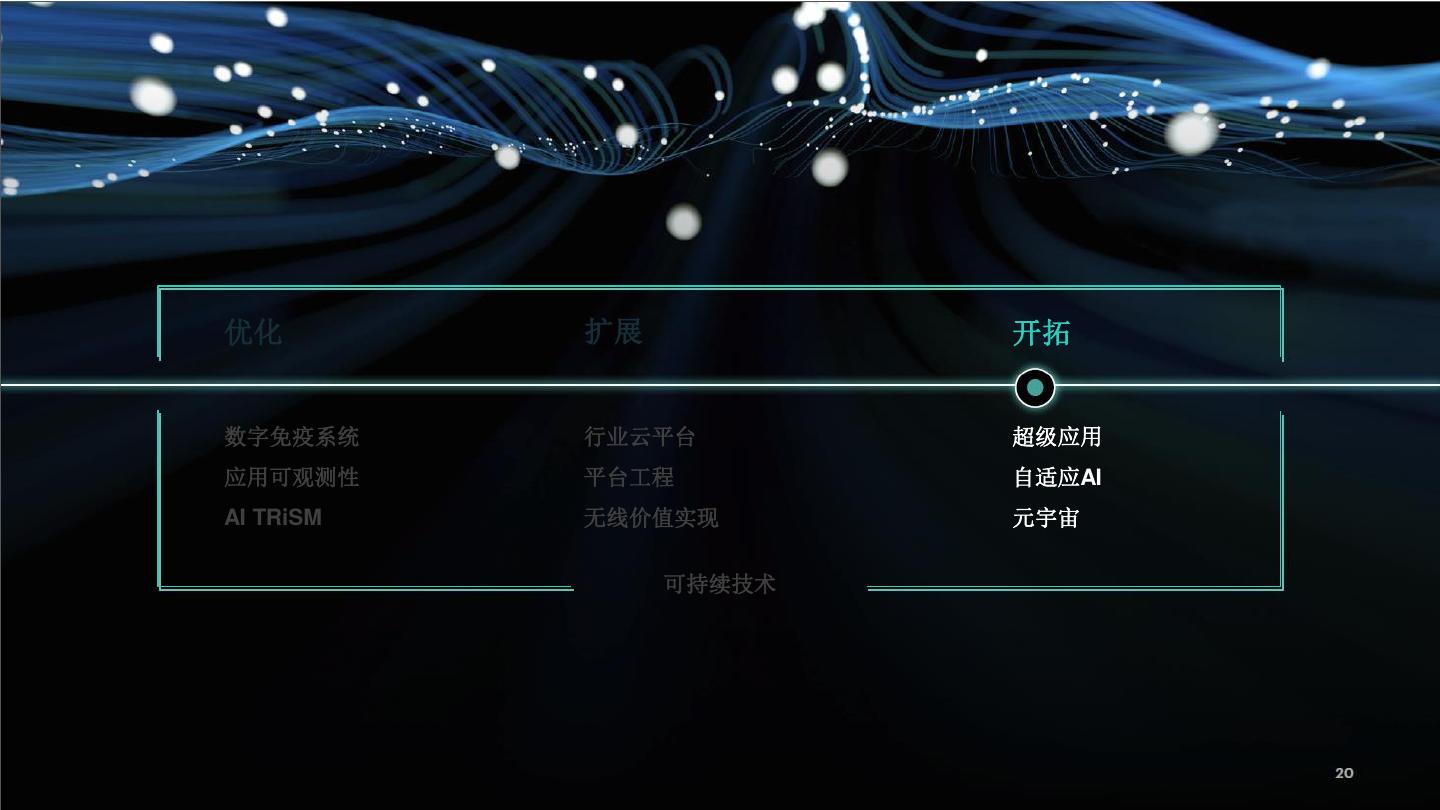 20 .优化 扩展 开拓 数字免疫系统 行业云平台 超级应用 应用可观测性 平台工程 自适应AI AI TRiSM 无线价值实现 元宇宙 可持续技术