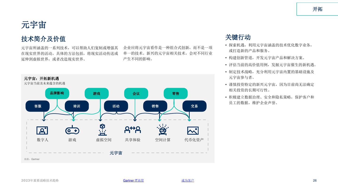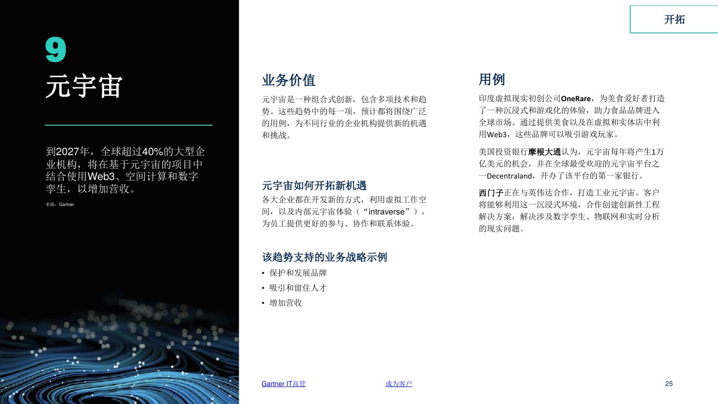 25 . 开拓 9 用例 元宇宙 业务价值 元宇宙是一种组合式创新,包含多项技术和趋 印度虚拟现实初创公司OneRare,为美食爱好者打造 势。这些趋势中的每一项,预计都将围绕广泛 了一种沉浸式和游戏化的体验,助力食品品牌进入 的用例,为不同行业的企业机构提供新的机遇 全球市场。通过提供美食以及在虚拟和实体店中利 和挑战。 用Web3,这些品牌可以吸引游戏玩家。 到2027年,全球超过40%的大型企 美国投资银行摩根大通认为,元宇宙每年将产生1万 业机构,将在基于元宇宙的项目中 亿美元的机会,并在全球最受欢迎的元宇宙平台之 结合使用Web3、空间计算和数字 一Decentraland,开办了该平台的第一家银行。 孪生,以增加营收。 元宇宙如何开拓新机遇 西门子正在与英伟达合作,打造工业元宇宙。客户 各大企业都在开发新的方式,利用虚拟工作空 来源:Gartner 将能够利用这一沉浸式环境,合作创建创新性工程 间,以及内部元宇宙体验(“intraverse”), 解决方案,解决涉及数字孪生、物联网和实时分析 为员工提供更好的参与、协作和联系体验。 的现实问题。 该趋势支持的业务战略示例 • 保护和发展品牌 • 吸引和留住人才 • 增加营收 Gartner IT高管 成为客户 25