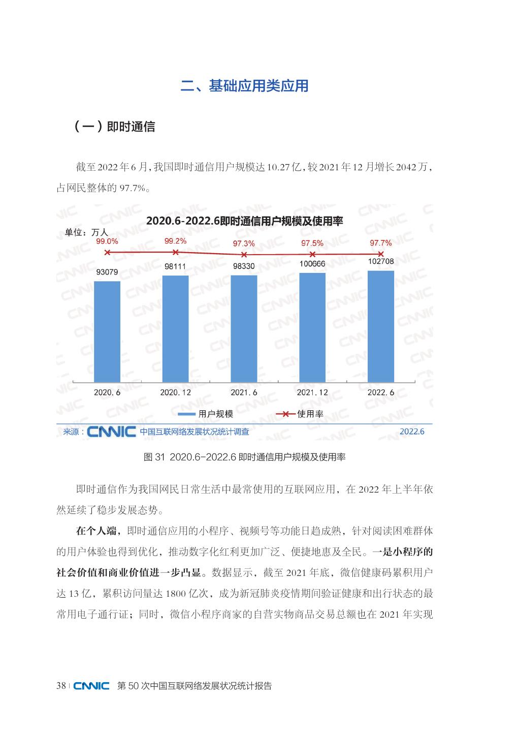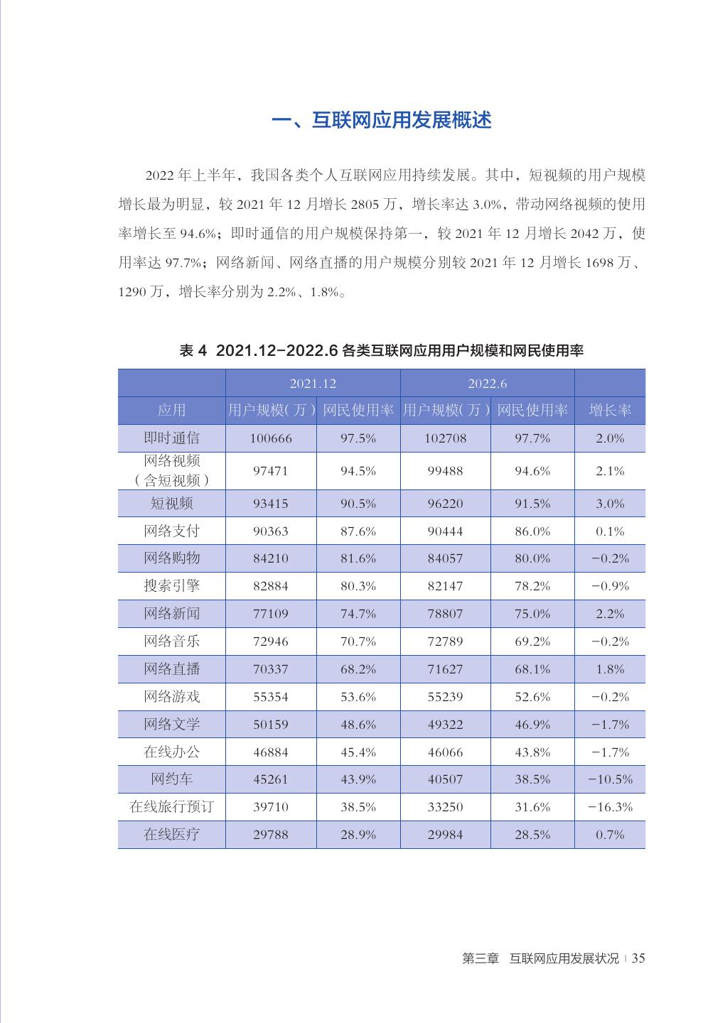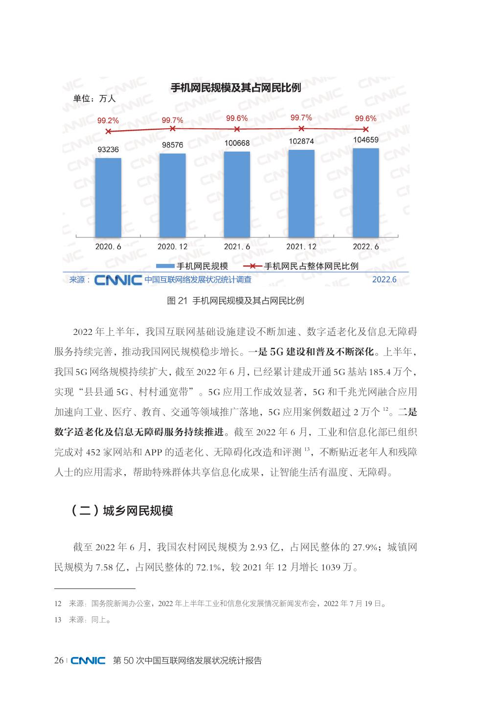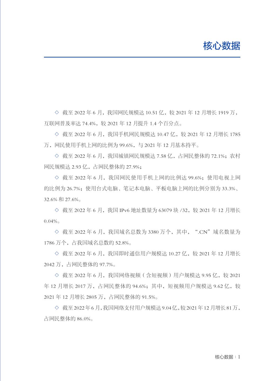11 . 核心数据 ◇ 截至 2022 年 6 月,我国网民规模达 10.51 亿,较 2021 年 12 月增长 1919 万, 互联网普及率达 74.4%,较 2021 年 12 月提升 1.4 个百分点。 ◇ 截至 2022 年 6 月,我国手机网民规模达 10.47 亿,较 2021 年 12 月增长 1785 万,网民使用手机上网的比例为 99.6%,与 2021 年 12 月基本持平。 ◇ 截至 2022 年 6 月,我国城镇网民规模达 7.58 亿,占网民整体的 72.1%;农村 网民规模达 2.93 亿,占网民整体的 27.9%; ◇ 截至 2022 年 6 月,我国网民使用手机上网的比例达 99.6%;使用电视上网 的比例为 26.7%;使用台式电脑、笔记本电脑、平板电脑上网的比例分别为 33.3%、 32.6% 和 27.6%。 ◇ 截至 2022 年 6 月,我国 IPv6 地址数量为 63079 块 /32,较 2021 年 12 月增长 0.04%。 ◇ 截至 2022 年 6 月,我国域名总数为 3380 万个,其中,“.CN”域名数量为 1786 万个,占我国域名总数的 52.8%。 ◇ 截至 2022 年 6 月,我国即时通信用户规模达 10.27 亿,较 2021 年 12 月增长 2042 万,占网民整体的 97.7%。 ◇ 截至 2022 年 6 月,我国网络视频(含短视频)用户规模达 9.95 亿,较 2021 年 12 月增长 2017 万,占网民整体的 94.6%;其中,短视频用户规模达 9.62 亿,较 2021 年 12 月增长 2805 万,占网民整体的 91.5%。 ◇ 截至 2022 年 6 月,我国网络支付用户规模达 9.04 亿,较 2021 年 12 月增长 81 万, 占网民整体的 86.0%。 核心数据 | 1