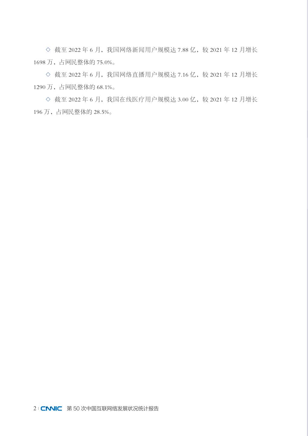 12 . 5 ◇ 截至 2022 年 6 月,我国网络新闻用户规模达 7.88 亿,较 2021 年 12 月增长 1698 万,占网民整体的 75.0%。 ◇ 截至 2022 年 6 月,我国网络直播用户规模达 7.16 亿,较 2021 年 12 月增长 1290 万,占网民整体的 68.1%。 ◇ 截至 2022 年 6 月,我国在线医疗用户规模达 3.00 亿,较 2021 年 12 月增长 196 万,占网民整体的 28.5%。 2| 第 50 次中国互联网络发展状况统计报告