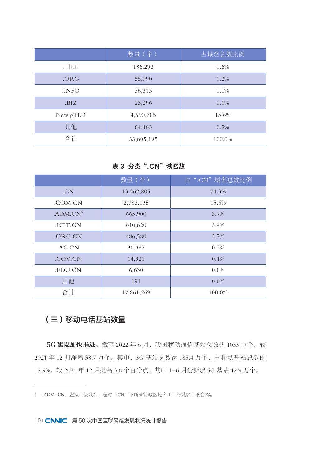 20 . 数量(个) 占域名总数比例 . 中国 186,292 0.6% .ORG 55,990 0.2% .INFO 36,313 0.1% .BIZ 23,296 0.1% New gTLD 4,590,705 13.6% 其他 64,403 0.2% 合计 33,805,195 100.0% 表 3 分类“.CN”域名数 5 数量(个) 占“.CN”域名总数比例 .CN 13,262,805 74.3% .COM.CN 2,783,035 15.6% 5 .ADM.CN 665,900 3.7% .NET.CN 610,820 3.4% .ORG.CN 486,580 2.7% .AC.CN 30,387 0.2% .GOV.CN 14,921 0.1% .EDU.CN 6,630 0.0% 其他 191 0.0% 合计 17,861,269 100.0% (三)移动电话基站数量 5G 建设加快推进。截至 2022 年 6 月,我国移动通信基站总数达 1035 万个,较 2021 年 12 月净增 38.7 万个。其中,5G 基站总数达 185.4 万个,占移动基站总数的 17.9%,较 2021 年 12 月提高 3.6 个百分点,其中 1-6 月份新建 5G 基站 42.9 万个。 5 . ADM . CN:虚拟二级域名,是对“.CN”下所有行政区域名(二级域名)的合称。 10 | 第 50 次中国互联网络发展状况统计报告