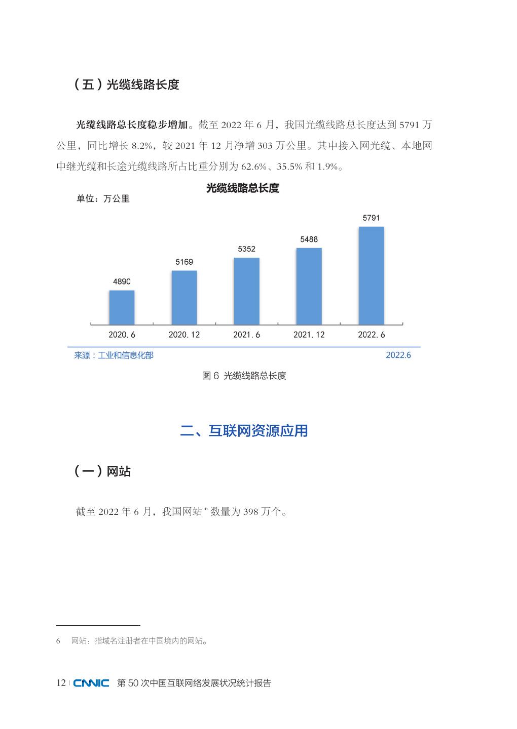 22 . (五)光缆线路长度 光缆线路总长度稳步增加。截至 2022 年 6 月,我国光缆线路总长度达到 5791 万 公里,同比增长 8.2%,较 2021 年 12 月净增 303 万公里。其中接入网光缆、本地网 中继光缆和长途光缆线路所占比重分别为 62.6%、35.5% 和 1.9%。 图 6 光缆线路总长度 二、互联网资源应用 (一)网站 截至 2022 年 6 月,我国网站 6 数量为 398 万个。 6 网站:指域名注册者在中国境内的网站。 12 | 第 50 次中国互联网络发展状况统计报告