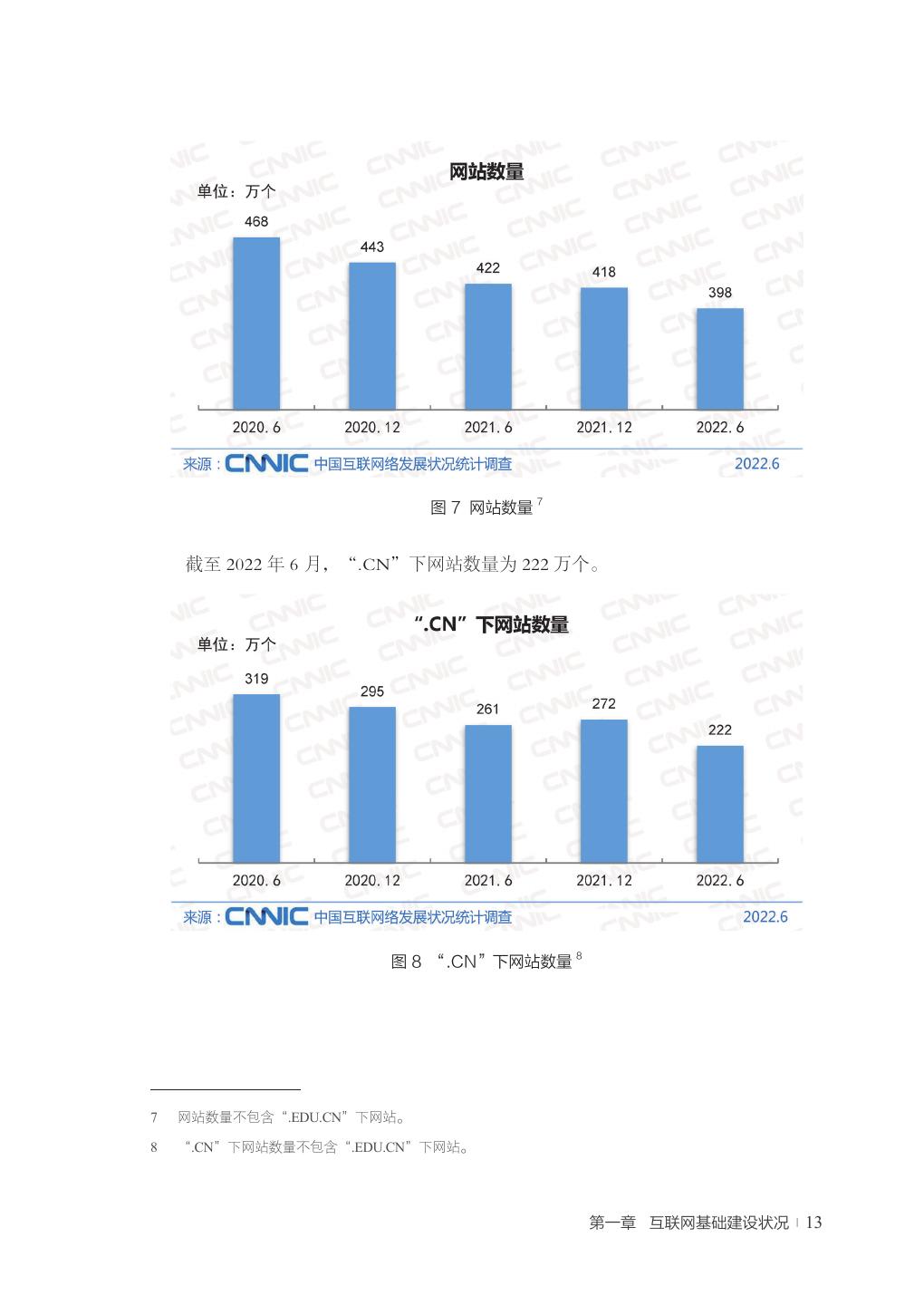 23 . 图 7 网站数量 7 截至 2022 年 6 月,“.CN”下网站数量为 222 万个。 图 8 “.CN”下网站数量 8 7 网站数量不包含“.EDU.CN”下网站。 8 “.CN”下网站数量不包含“.EDU.CN”下网站。 第一章 互联网基础建设状况 | 13
