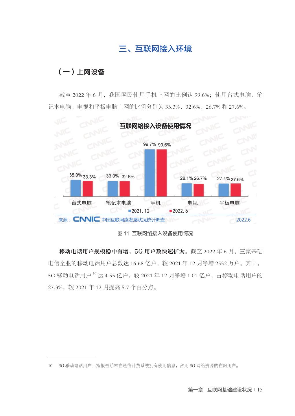 25 . 三、互联网接入环境 (一)上网设备 截至 2022 年 6 月,我国网民使用手机上网的比例达 99.6%;使用台式电脑、笔 记本电脑、电视和平板电脑上网的比例分别为 33.3%、32.6%、26.7% 和 27.6%。 图 11 互联网络接入设备使用情况 移动电话用户规模稳中有增,5G 用户数快速扩大。截至 2022 年 6 月,三家基础 电信企业的移动电话用户总数达 16.68 亿户,较 2021 年 12 月净增 2552 万户。其中, 5G 移动电话用户 10 达 4.55 亿户,较 2021 年 12 月净增 1.01 亿户,占移动电话用户的 27.3%,较 2021 年 12 月提高 5.7 个百分点。 10 5G 移动电话用户:指报告期末在通信计费系统拥有使用信息,占用 5G 网络资源的在网用户。 第一章 互联网基础建设状况 | 15