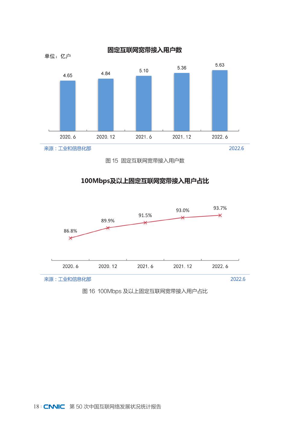 28 . 图 15 固定互联网宽带接入用户数 图 16 100Mbps 及以上固定互联网宽带接入用户占比 18 | 第 50 次中国互联网络发展状况统计报告