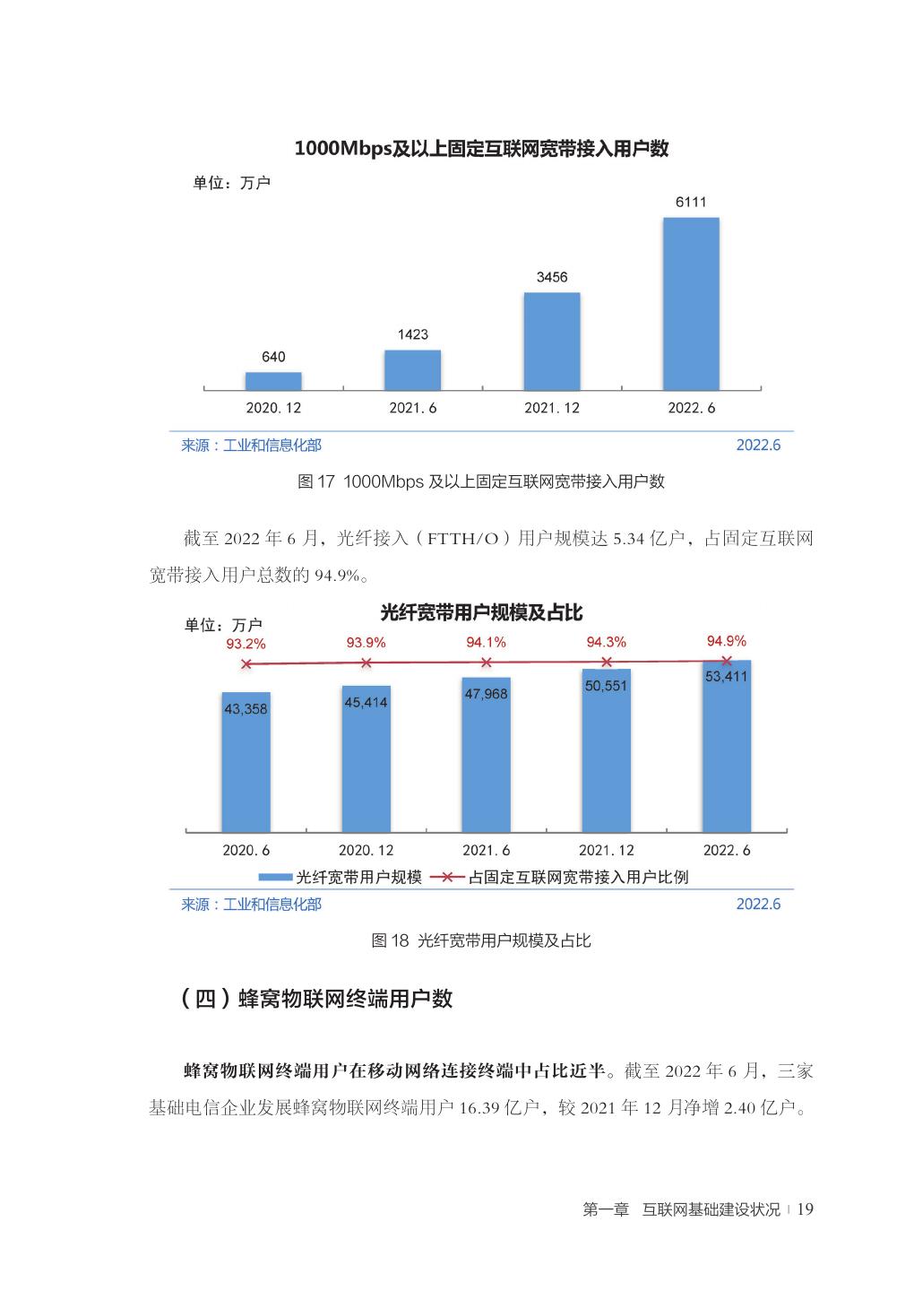 29 . 图 17 1000Mbps 及以上固定互联网宽带接入用户数 截至 2022 年 6 月,光纤接入(FTTH/O)用户规模达 5.34 亿户,占固定互联网 宽带接入用户总数的 94.9%。 图 18 光纤宽带用户规模及占比 (四)蜂窝物联网终端用户数 蜂窝物联网终端用户在移动网络连接终端中占比近半。截至 2022 年 6 月,三家 基础电信企业发展蜂窝物联网终端用户 16.39 亿户,较 2021 年 12 月净增 2.40 亿户。 第一章 互联网基础建设状况 | 19