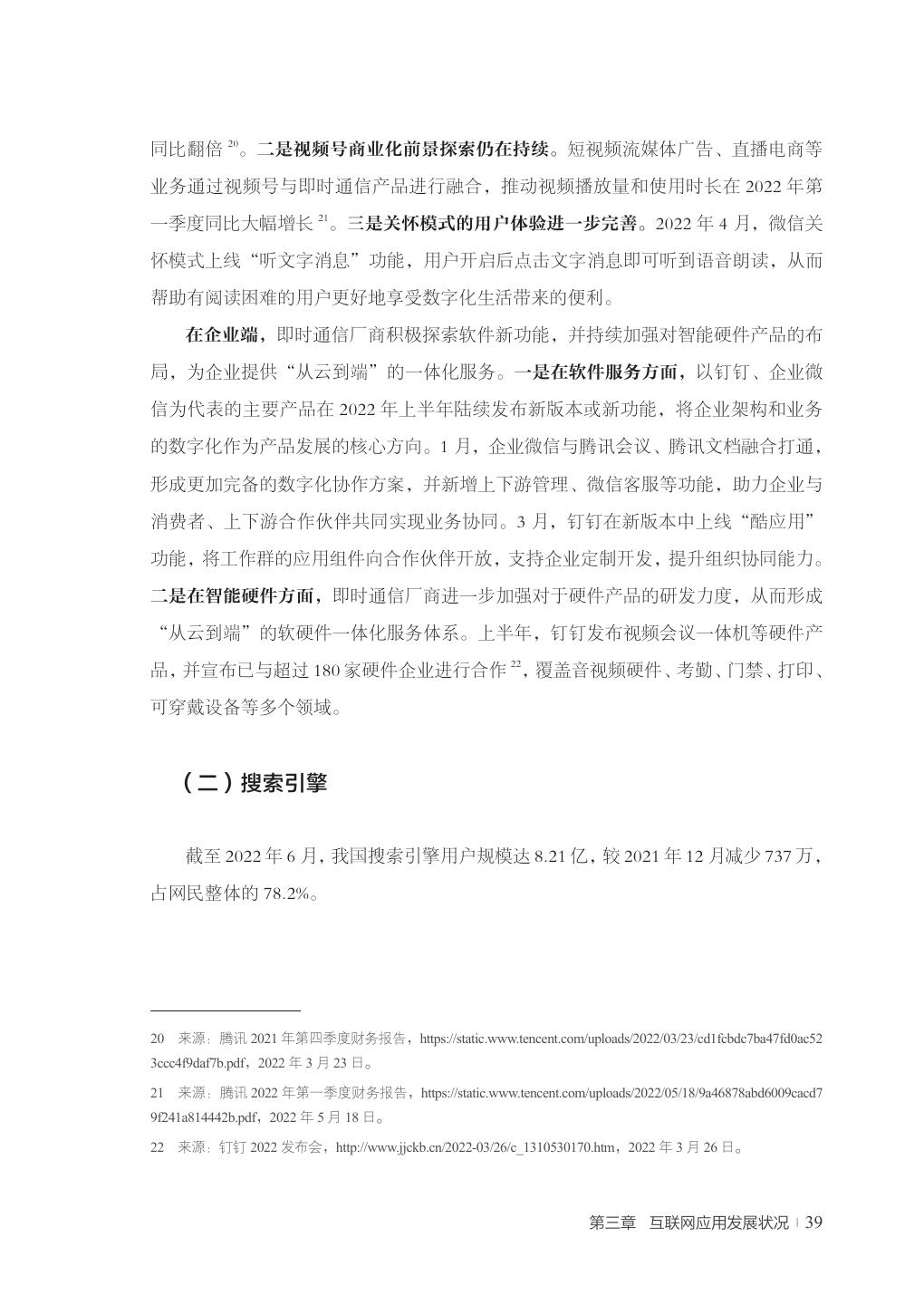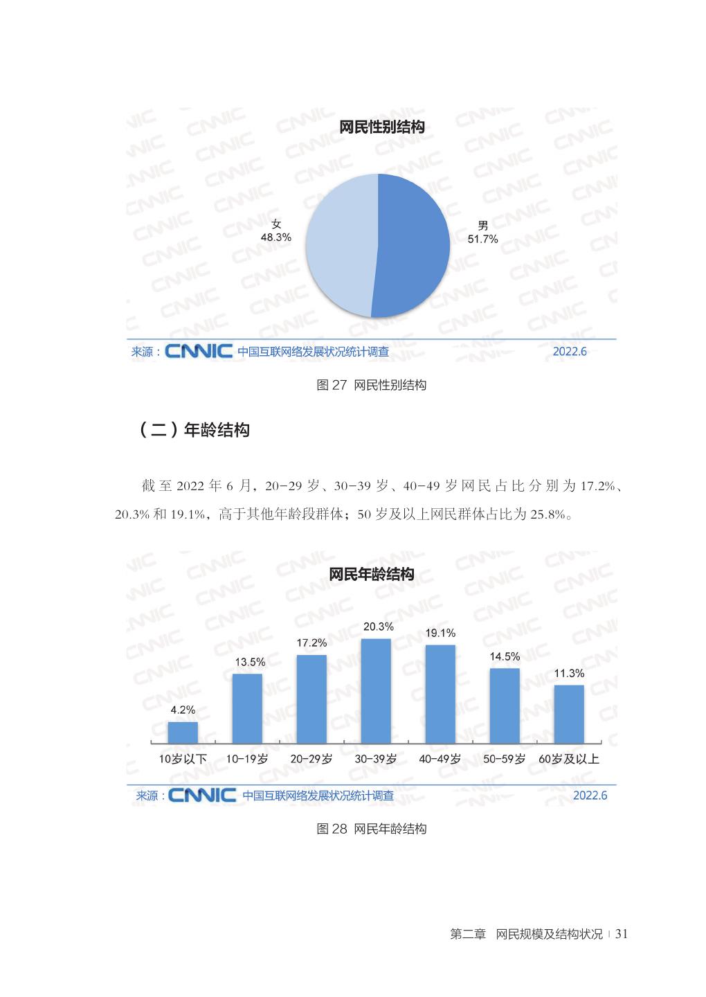6 .目 录 PART 网民规模及结构状况 2 一、网民规模 (一)总体网民规模 25 25 (二)城乡网民规模 26 (三)非网民规模 28 二、网民属性结构 30 (一)性别结构 30 (二)年龄结构 31 PART 互联网应用发展状况 3 一、互联网应用发展概述 35 二、基础应用类应用 38 (一)即时通信 38 (二)搜索引擎 39 (三)网络新闻 40 (四)在线办公 42 2| 第 50 次中国互联网络发展状况统计报告