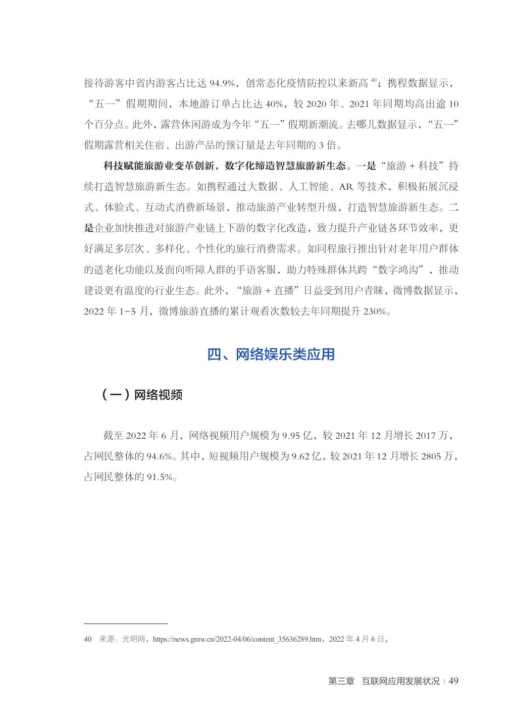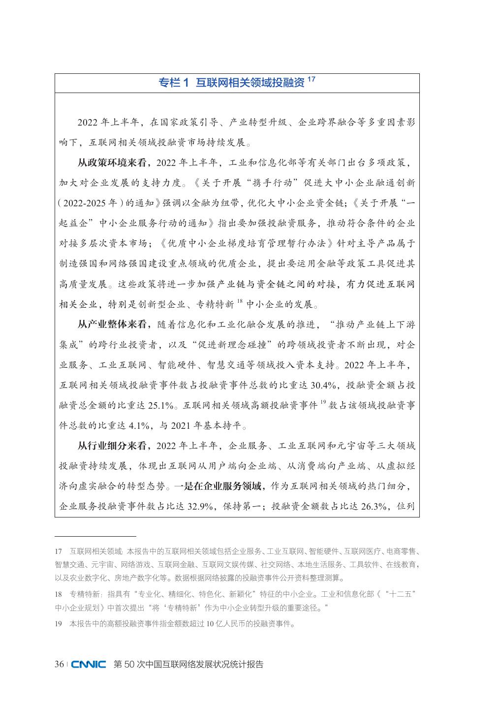 3 . 前 言 1997 年,国家主管部门研究决定由中国互联网络信息中心(CNNIC)牵头组织开 展中国互联网络发展状况统计调查,形成了每年年初和年中定期发布《中国互联网络发 展状况统计报告》(以下简称:《报告》)的惯例,至今已持续发布 49 次。《报告》 力图通过核心数据反映我国制造强国和网络强国建设历程,成为我国政府部门、国内外 行业机构、专家学者和广大人民群众了解中国互联网发展状况的重要参考。 2022 年上半年,新冠肺炎疫情和乌克兰危机导致风险挑战增多,我国经济发展环 境的复杂性、严峻性、不确定性上升,稳增长、稳就业、稳物价面临新的挑战。面对复 杂严峻环境和诸多风险挑战,全国工业和信息化系统全力以赴保通保畅、助企纾困、扩 大内需、稳定预期,为保持经济运行在合理区间做出了积极努力。在各方的共同努力下, 我国网上零售对市场销售增长贡献率持续提升,信息服务消费、高技术制造业投资保持 较快增长,数字经济已成为稳增长、促转型、保民生的重要支柱。 作为制造强国和网络强国的忠实记录者,中国互联网络信息中心持续跟进我国互联 网发展进程,不断扩大研究范围,深化研究领域。 《报告》围绕互联网基础建设、网民规模、 互联网应用、工业互联网、互联网安全等五个方面,力求通过多角度、全方位的数据展现, 综合反映 2022 年上半年我国互联网发展状况。 在此,衷心感谢工业和信息化部、中央网络安全和信息化委员会办公室、国家统计 局、共青团中央等部门对《报告》的指导和支持。同时,向在本次互联网络发展状况统 计调查工作中给予支持的机构和广大网民致以诚挚的谢意! 中国互联网络信息中心 2022 年 8 月 前言 | 1