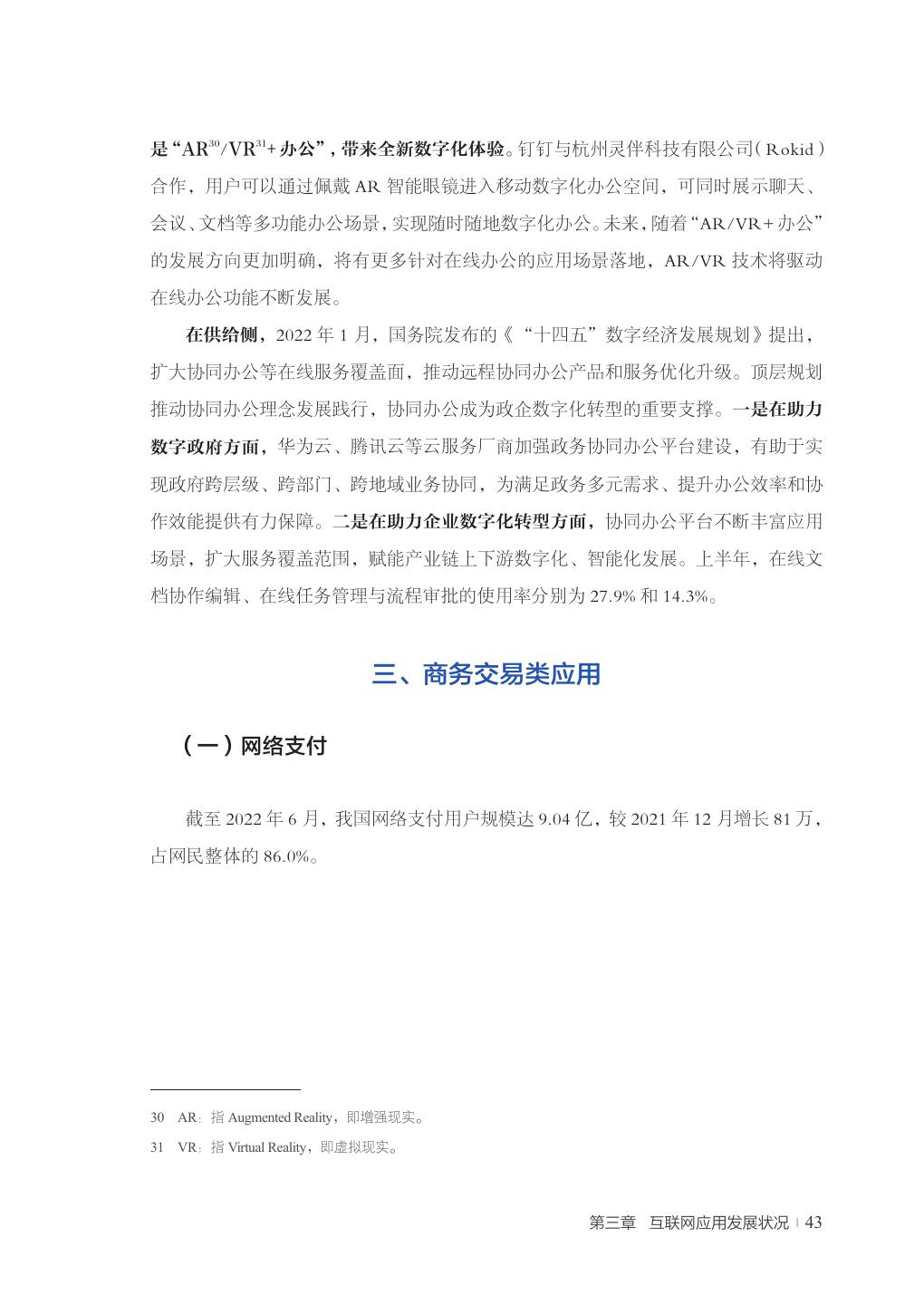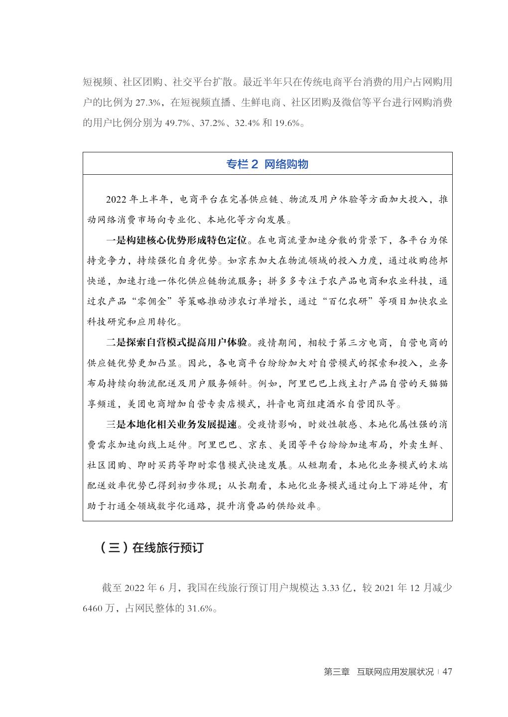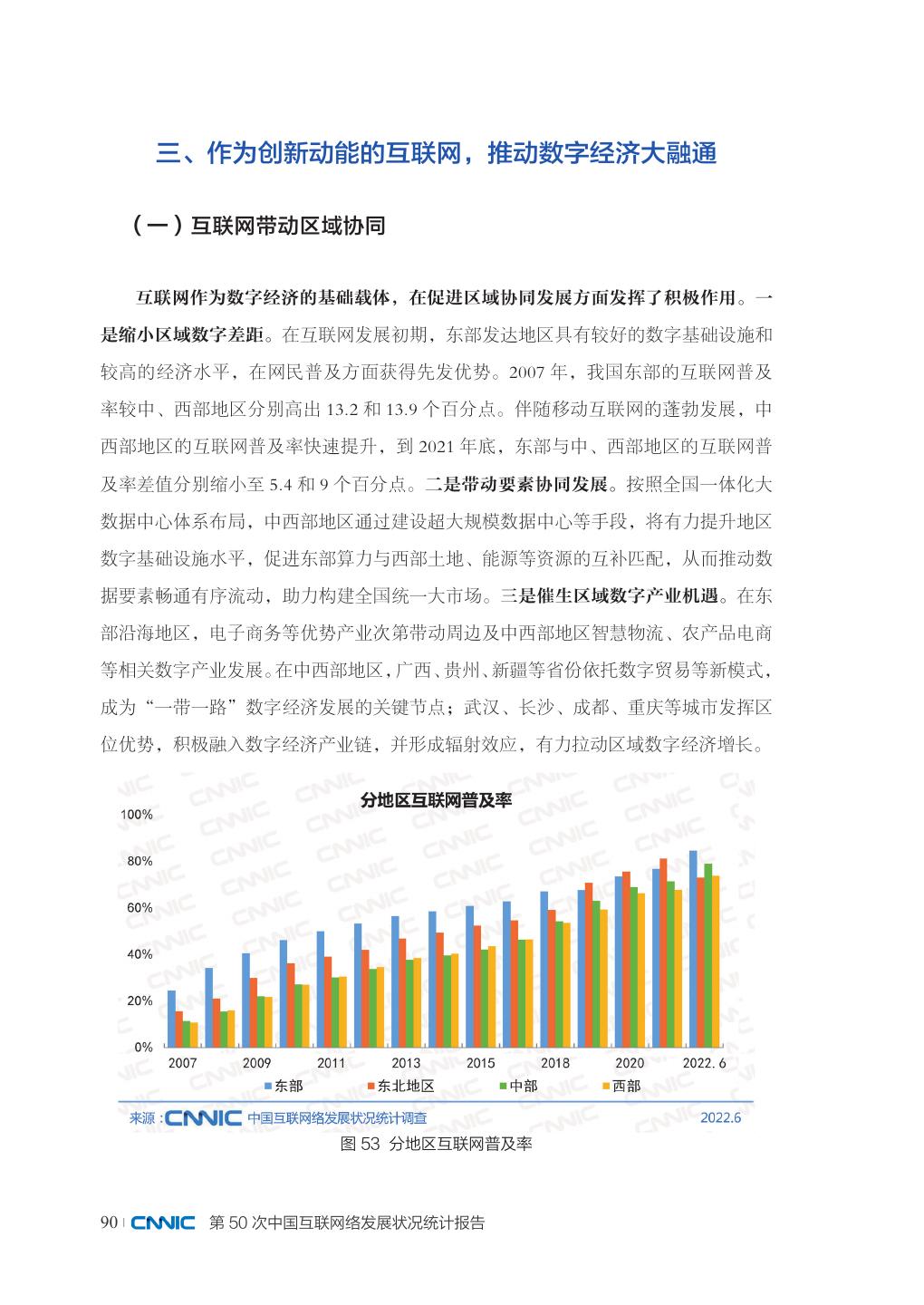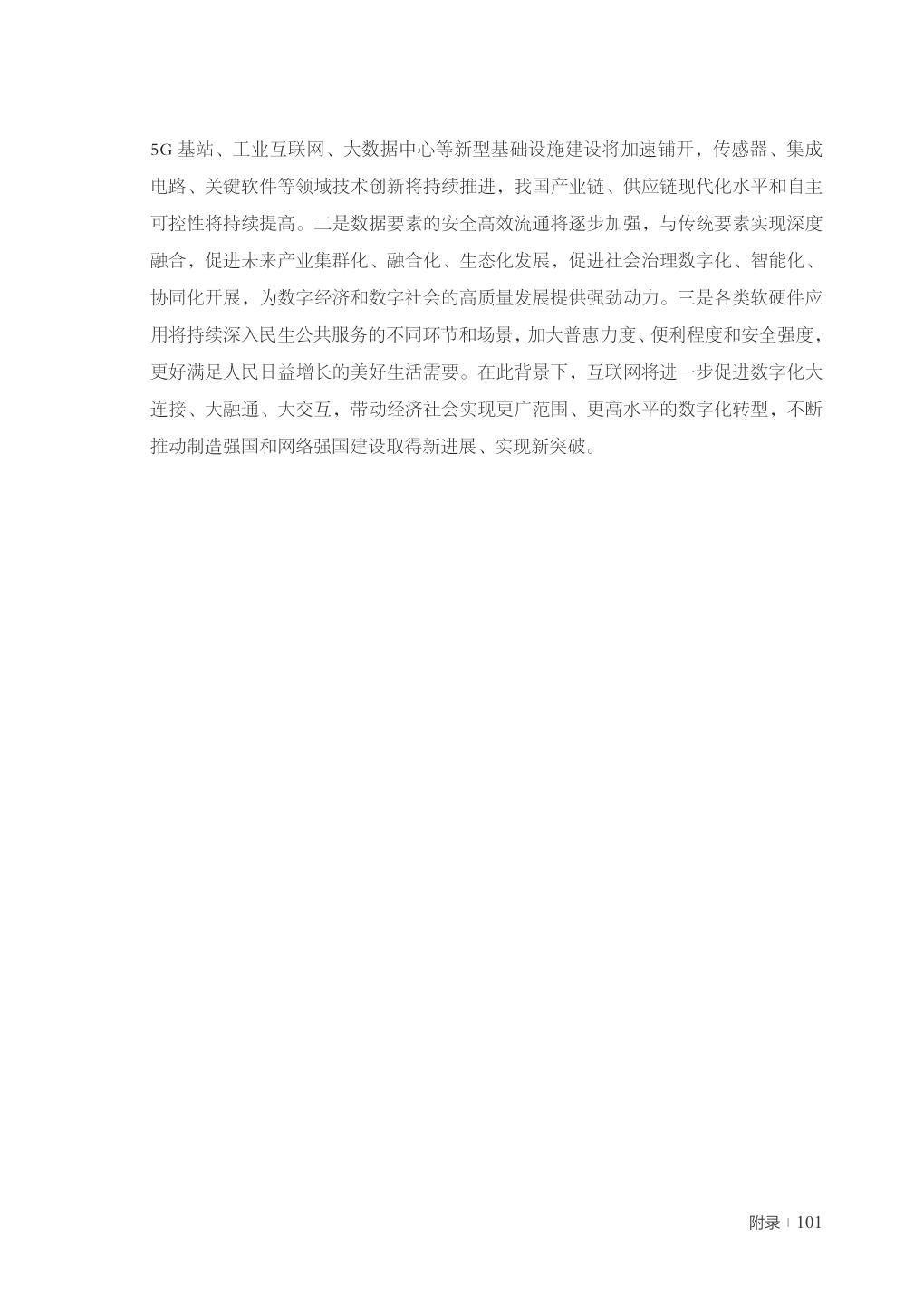 9 . 目 录 二、作为基础设施的互联网,支撑数字空间大连接 85 (一)互联网扩展多维节点 85 (二)互联网连接多样终端 86 (三)互联网汇聚多元主体 87 (四)互联网打通公共资源 88 三、作为创新动能的互联网,推动数字经济大融通 90 (一)互联网带动区域协同 90 (二)互联网催生应用生态 91 (三)互联网加速产业变迁 92 (四)互联网重构消费模式 94 四、作为关系媒介的互联网,激发数字社会大交互 96 (一)互联网促进红利共享 96 (二)互联网激发就业活力 97 (三)互联网助力乡村振兴 98 (四)互联网催生文化圈层 99 附录二 调查方法 102 附录三 互联网基础资源附表 106 附录四 调查支持单位 113 目录 | 5