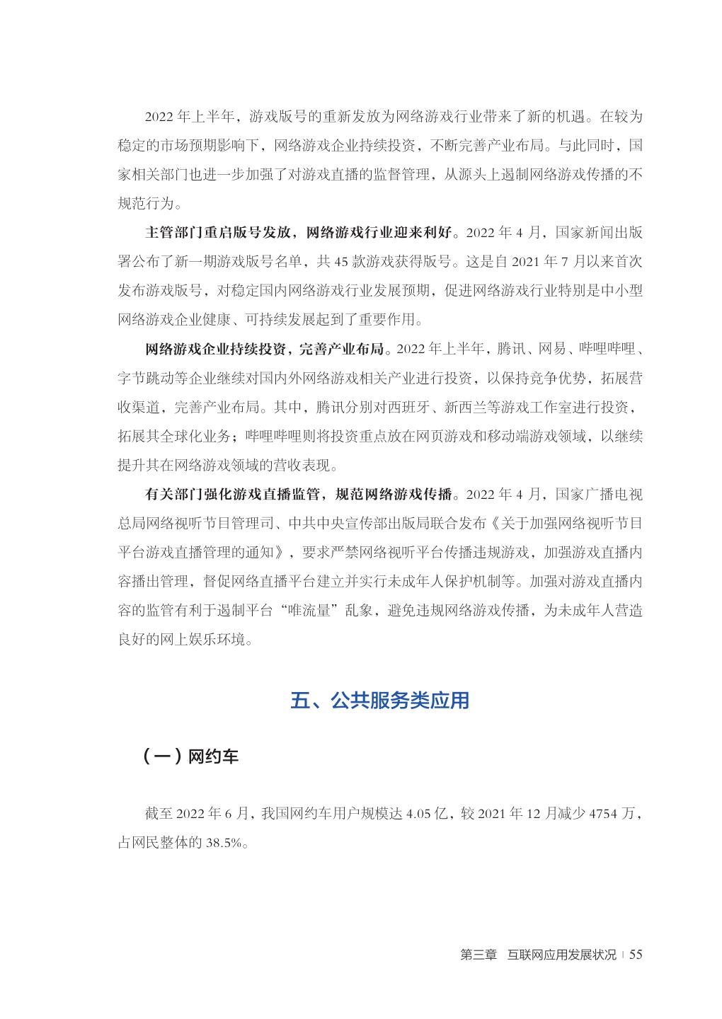 24 . (二)移动互联网接入流量 移动互联网流量快速增长。2022 年上半年,我国移动互联网接入流量达 1241 亿 GB,同比增长 20.2%。 图 9 移动互联网接入流量 (三)APP 数量及分类 截至 2022 年 6 月,我国国内市场上监测到的 APP 数量为 232 万款。 图 10 APP 数量 9 9 APP 数量:为更精准反应移动应用市场动态,监测数据由“累计方法(即统计数据采用累计计算方法)”改为“在 架方法(即统计数据仅针对在架应用计算,剔除下架应用)”。 14 | 第 50 次中国互联网络发展状况统计报告