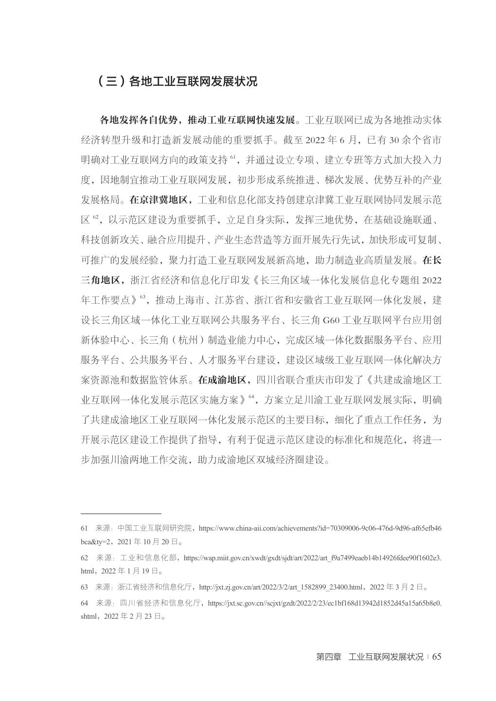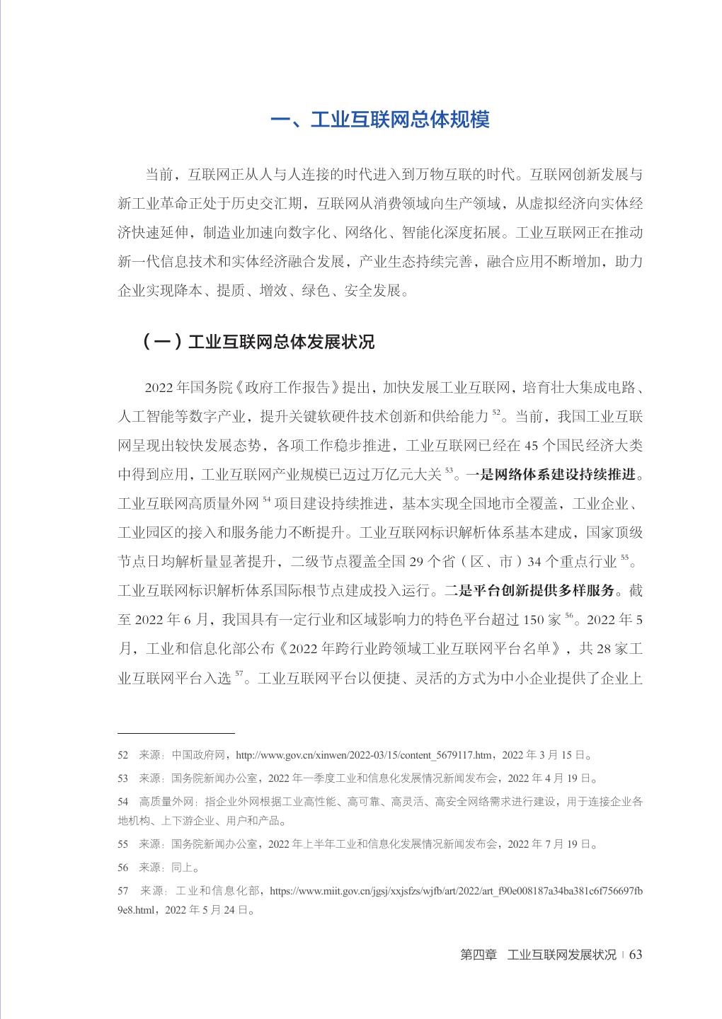 7 . 目 录 三、商务交易类应用 43 (一)网络支付 43 (二)网络购物 45 (三)在线旅行预订 47 四、网络娱乐类应用 49 (一)网络视频 49 (二)网络直播 52 (三)网络游戏 54 五、公共服务类应用 55 (一)网约车 55 (二)在线医疗 57 PART 工业互联网发展状况 4 一、工业互联网总体规模 (一)工业互联网总体发展状况 63 63 (二)工业互联网政策发展状况 64 (三)各地工业互联网发展状况 65 目录 | 3