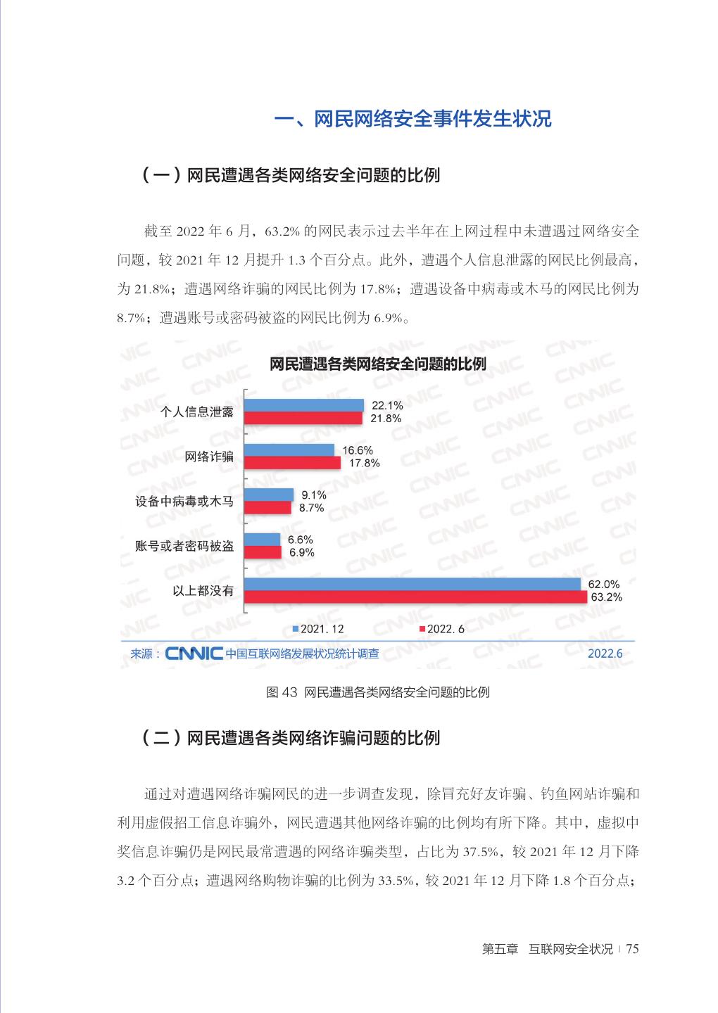 8 .目 录 二、5G+ 工业互联网应用发展 66 (一)石化化工行业应用 66 (二)建材行业应用 67 (三)港口行业应用 68 (四)纺织行业应用 68 (五)家电行业应用 69 PART 互联网安全状况 5 一、网民网络安全事件发生状况 (一)网民遭遇各类网络安全问题的比例 75 75 (二)网民遭遇各类网络诈骗问题的比例 75 二、分布式拒绝服务攻击 76 三、网络安全相关举报和受理 77 (一)接报网络安全事件数量 77 (二)全国各级网络举报部门受理举报数量 78 附录一 从 25 年统计数据看中国互联网发展 83 一、概述 83 4| 第 50 次中国互联网络发展状况统计报告
