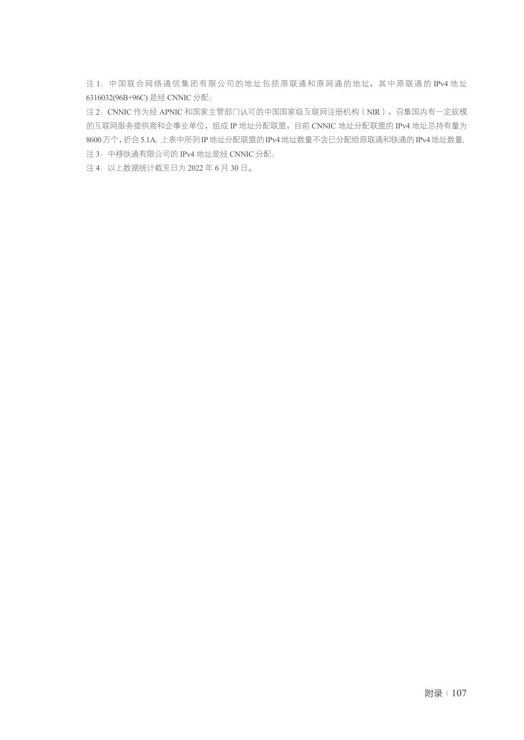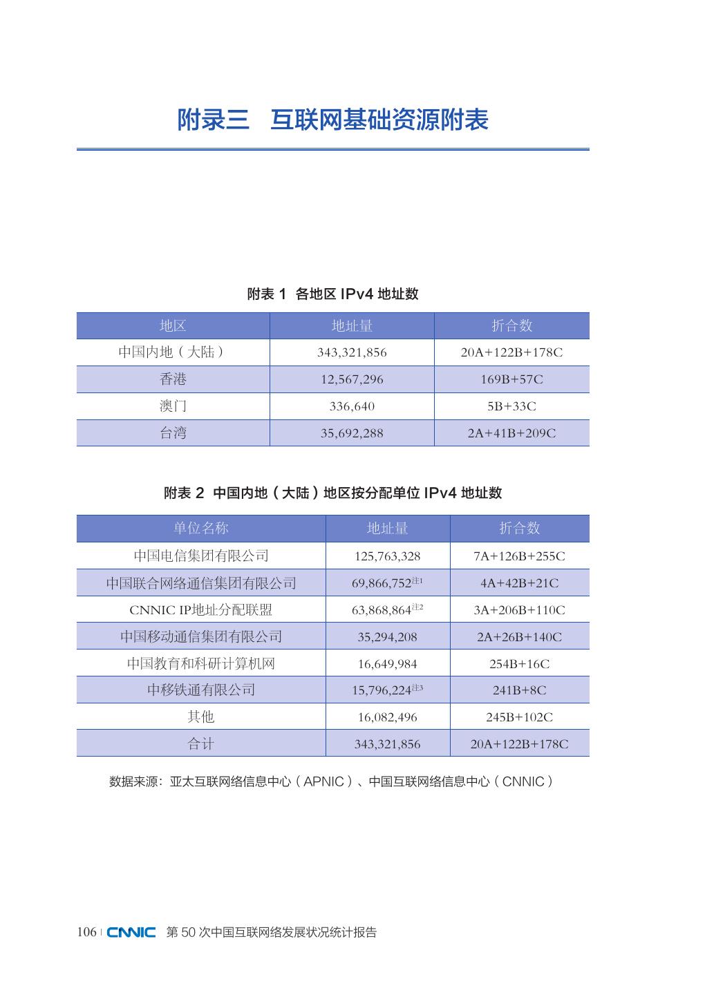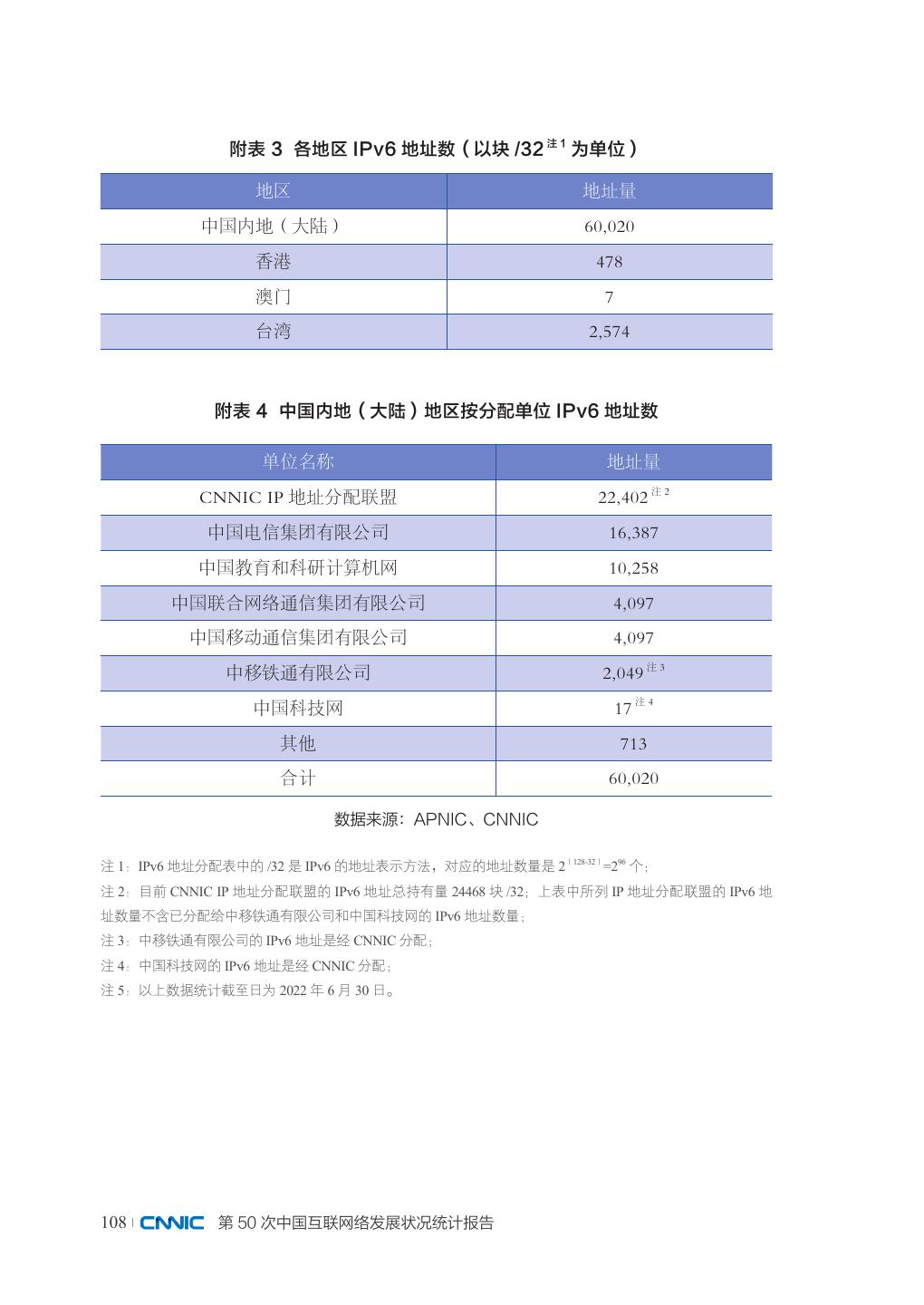 17 . 一、互联网基础资源 截至 2022 年 6 月,我国 IPv4 地址数量为 39192 万个,IPv6 地址数量为 63079 块 /32,IPv6 活跃用户数达 6.83 亿;我国域名总数为 33801 万个,其中,“.CN”域名 数量为 1786 万个,占我国域名总数的 52.8%;我国移动电话基站总数达 1035 万个, 互联网宽带接入端口数量达 10.35 亿个,光缆线路总长度达 5791 万公里。 表 1 2021.12-2022.6 互联网基础资源对比 2021 年 12 月 2022 年 6 月 IPv4(个) 392,486,656 391,918,080 IPv6(块 /32) 63,052 63,079 IPv6 活跃用户数(亿) 6.08 6.83 域名(个) 35,931,063 33,805,195 其中“.CN”域名(个) 20,410,139 17,861,269 移动电话基站(万个) 996 1,035 互联网宽带接入端口(亿个) 10.18 10.35 光缆线路长度(万公里) 5,488 5,791 (一)IP 地址 截至 2022 年 6 月,我国 IPv6 地址数量为 63079 块 /32,较 2021 年 12 月增长 0.04%。 CNNIC 监测范围内的全球知名度较高的 23 个公共递归服务中,有 14 个递归服务提 供 IPv6 地址,约占 60.87%,其中有 13 个解析服务正常。 1 域名总数为取整数据。 第一章 互联网基础建设状况 | 7