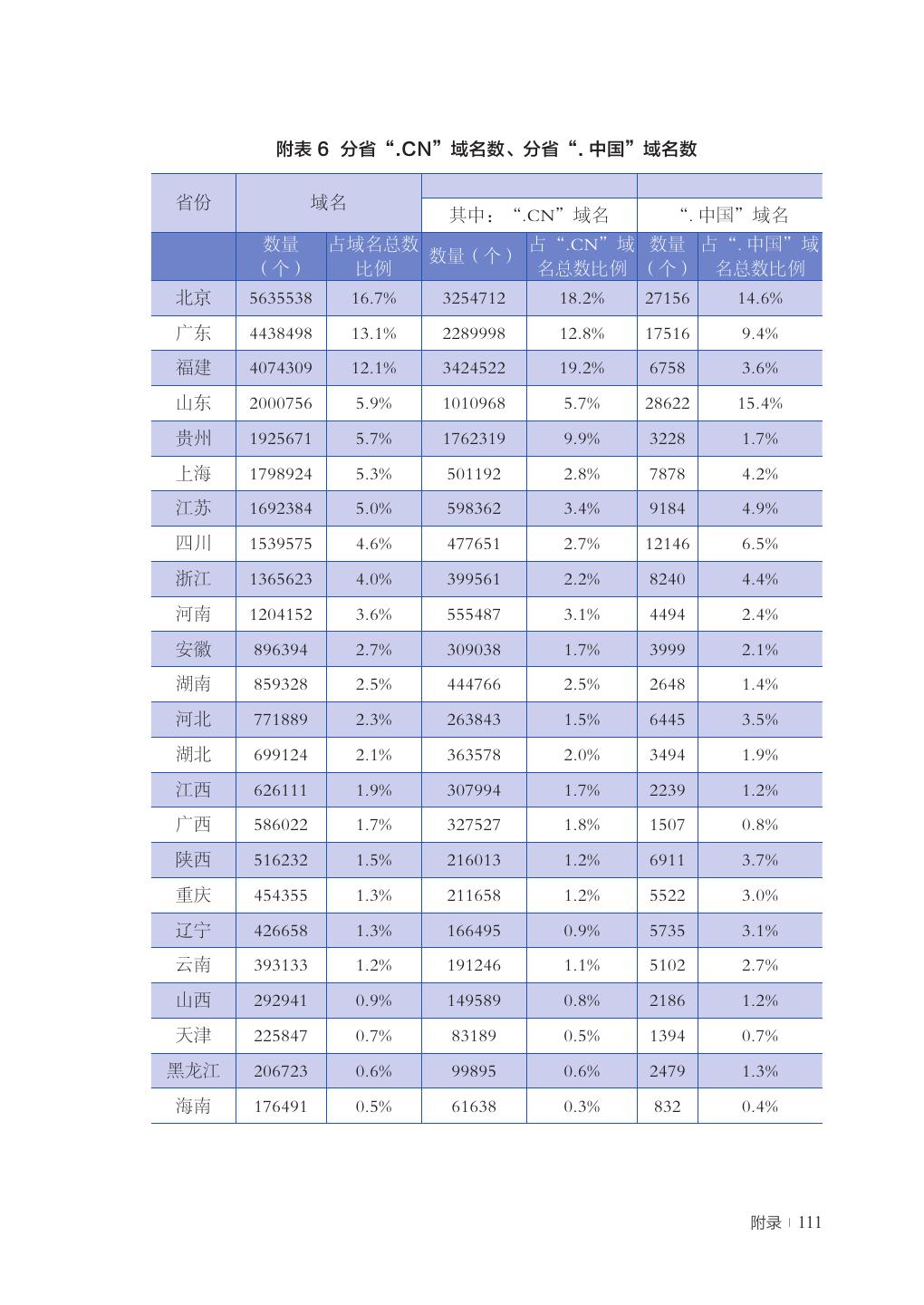 19 . 图 3 IPv4 地址数量 3 (二)域名 截至 2022 年 6 月,我国域名总数为 3380 万个。其中,“.CN”域名数量为 1786 万个,占我国域名总数的 52.8%;“.COM”域名数量为 1009 万个,占我国域名总数 的 29.9%;“. 中国”域名数量为 19 万个,占我国域名总数的 0.6%;新通用顶级域名 (New gTLD)数量为 459 万个,占我国域名总数的 13.6%。 表 2 分类域名数 4 数量(个) 占域名总数比例 .CN 17,861,269 52.8% .COM 10,093,729 29.9% .NET 893,198 2.6% 3 数据均含港、澳、台地区。 4 来源:通用顶级域名(gTLD)及新通用顶级域名(New gTLD)由国内域名注册单位协助提供。 “.CN” “. 中国”域名数量为境内注册量。 第一章 互联网基础建设状况 | 9