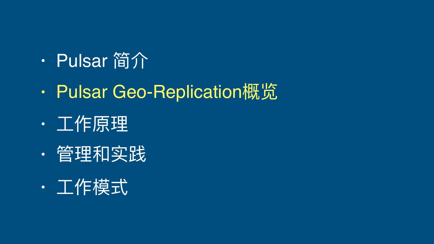 3 .• Pulsar 简介 • Pulsar Geo-Replication概览 • ⼯工作原理理 • 管理理和实践 • ⼯工作模式