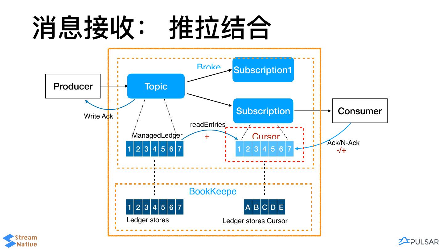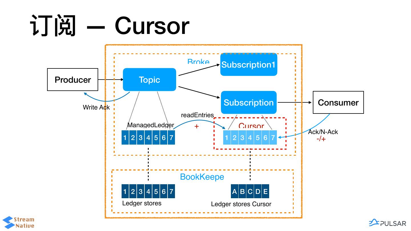 20 .订阅 — Cursor Broke Subscription1 Producer Topic … Write Ack Subscription Consumer readEntries ManagedLedger + Cursor Ack/N-Ack 1 2 3 4 5 6 7 1 2 3 4 5 6 7 -/+ BookKeepe 1 2 3 4 5 6 7 A B C D E Ledger stores Ledger stores Cursor