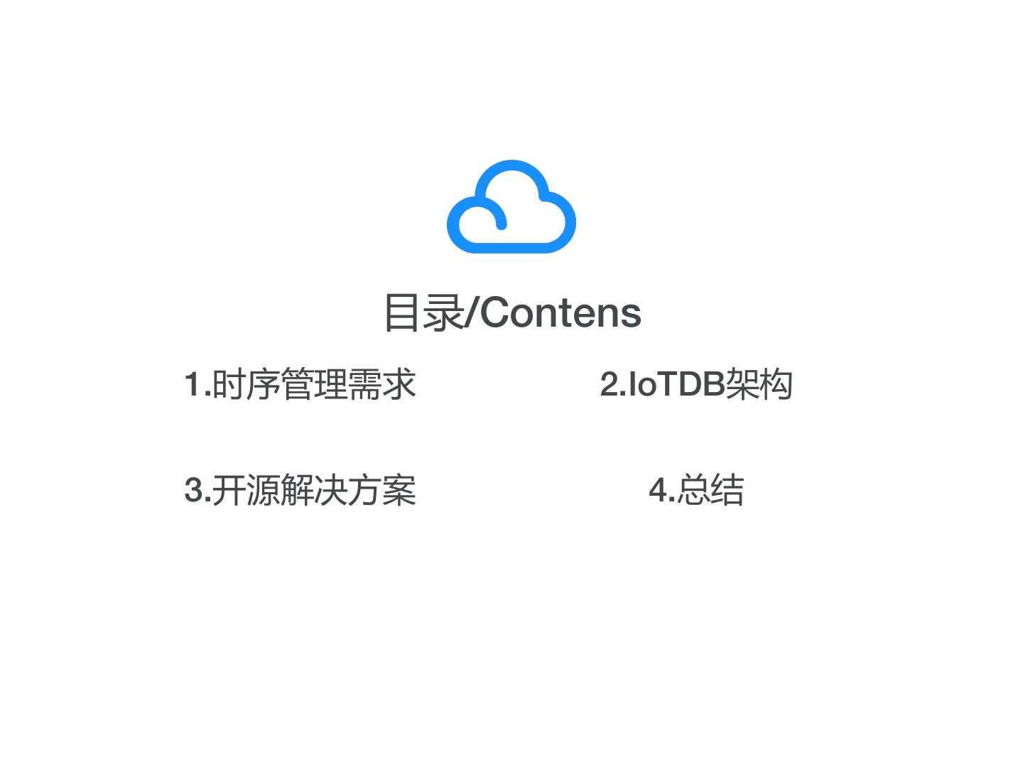 3 . 目录/Contens 1.时序管理需求 2.IoTDB架构 3.开源解决方案 4.总结