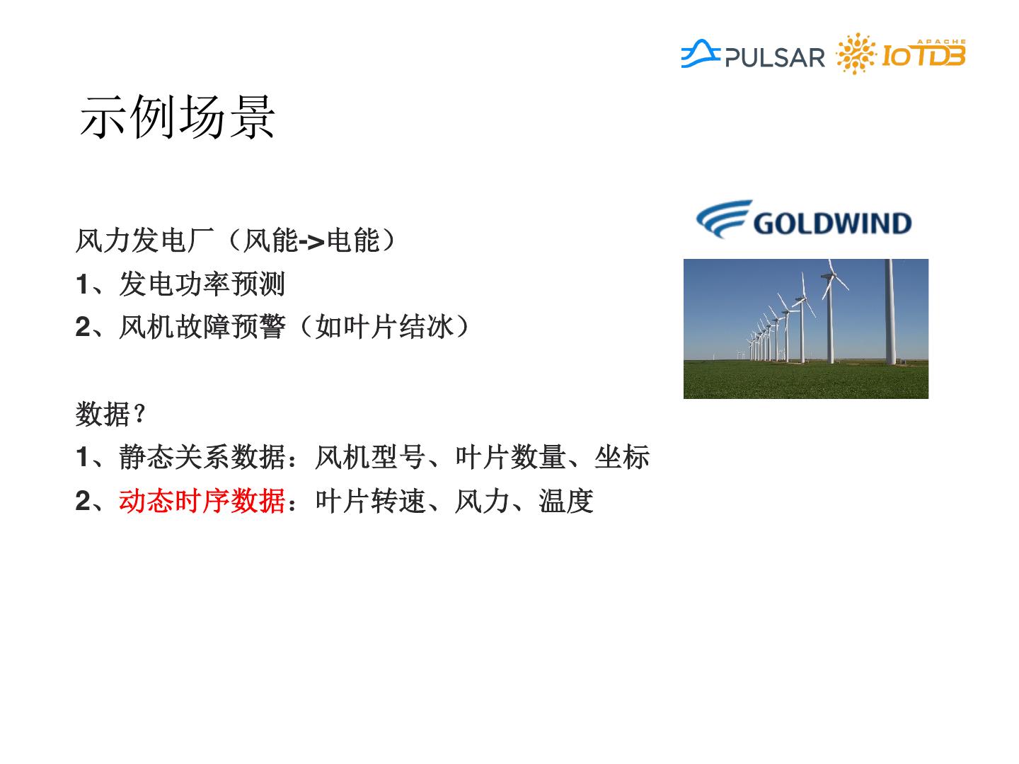 5 .示例场景 风力发电厂(风能->电能) 1、发电功率预测 2、风机故障预警(如叶片结冰) 数据? 1、静态关系数据:风机型号、叶片数量、坐标 2、动态时序数据:叶片转速、风力、温度