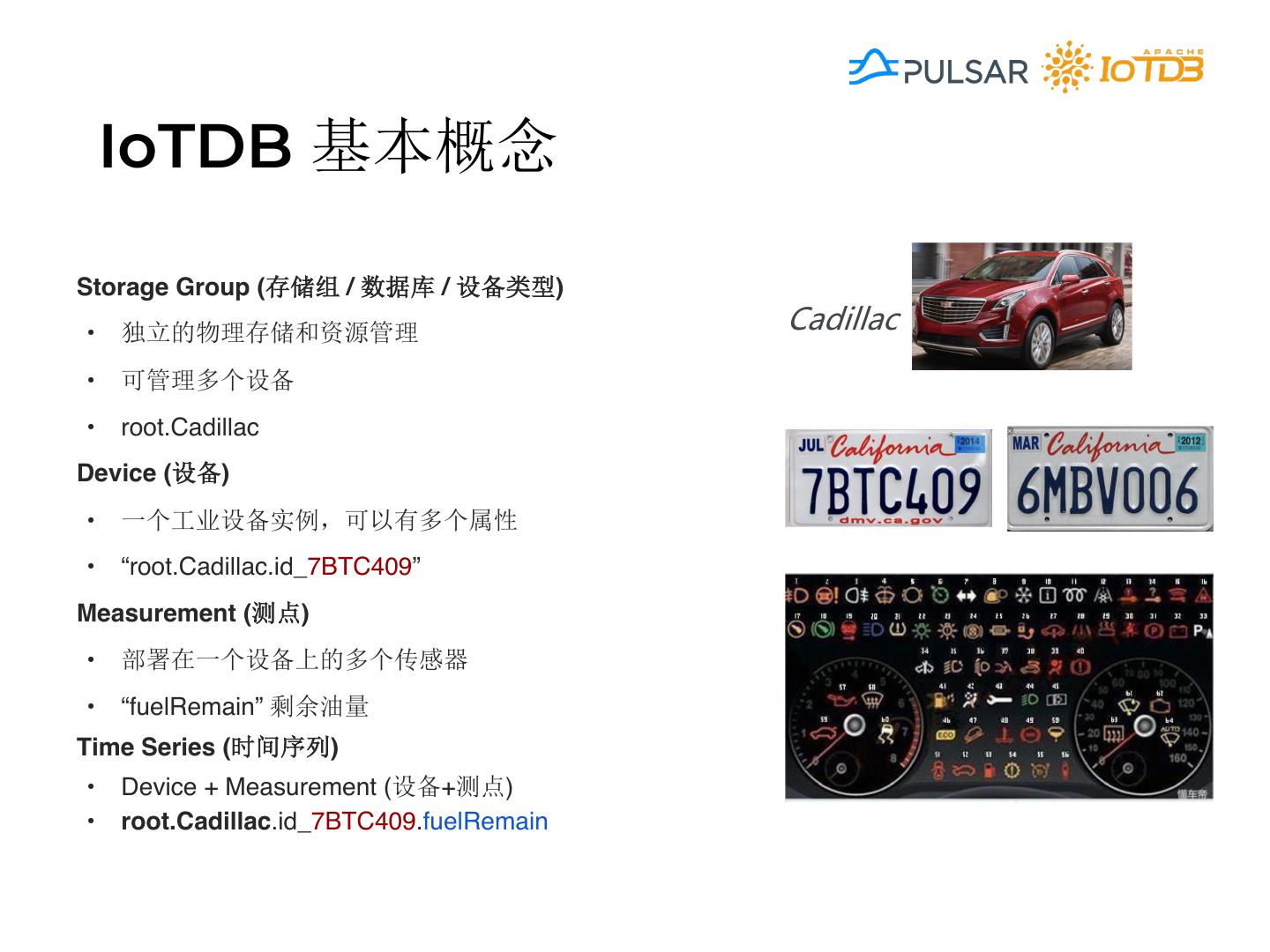 10 . IoTDB 基本概念 Storage Group (存储组 / 数据库 / 设备类型) • 独立的物理存储和资源管理 Cadillac • 可管理多个设备 • root.Cadillac Device (设备) • 一个工业设备实例,可以有多个属性 • “root.Cadillac.id_7BTC409” Measurement (测点) • 部署在一个设备上的多个传感器 • “fuelRemain” 剩余油量 Time Series (时间序列) • Device + Measurement (设备+测点) • root.Cadillac.id_7BTC409.fuelRemain
