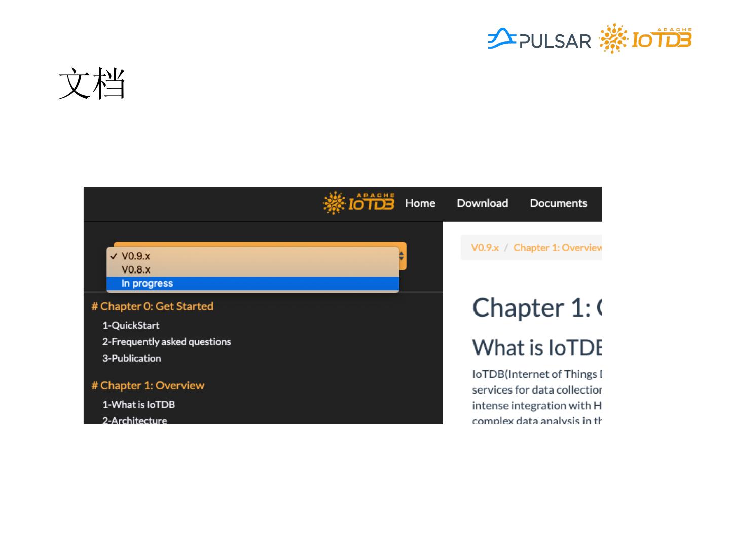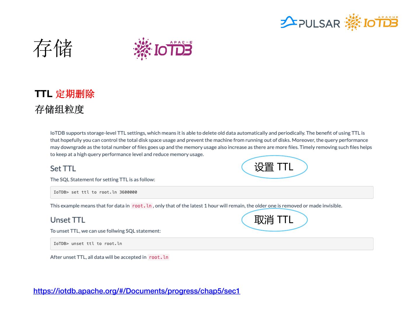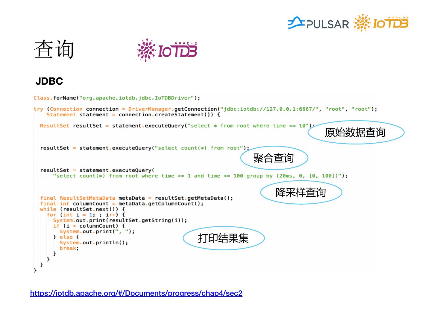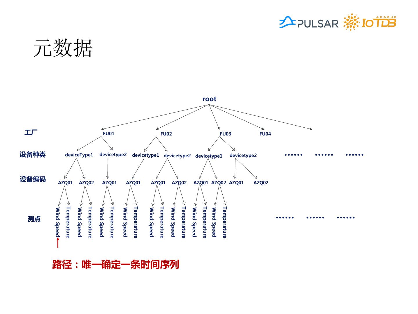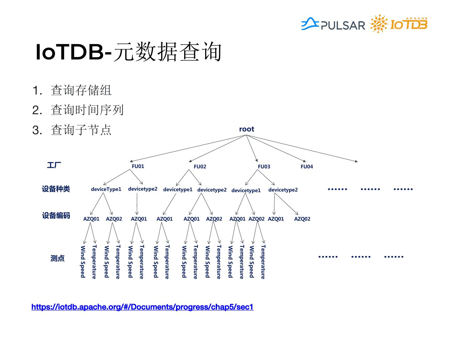 20 .IoTDB-元数据查询 1. 查询存储组 2. 查询时间序列 3. 查询子节点 root 工厂 FU01 FU02 FU03 FU04 设备种类 deviceType1 devicetype2 devicetype1 devicetype2 devicetype1 devicetype2 …… …… …… 设备编码 AZQ01 AZQ02 AZQ01 AZQ01 AZQ01 AZQ02 AZQ01 AZQ02 AZQ01 AZQ02 Temperature Temperature Temperature Temperature Temperature Temperature Temperature Temperature Wind Speed Wind Speed Wind Speed Wind Speed Wind Speed Wind Speed Wind Speed Wind Speed 测点 …… …… …… https://iotdb.apache.org/#/Documents/progress/chap5/sec1