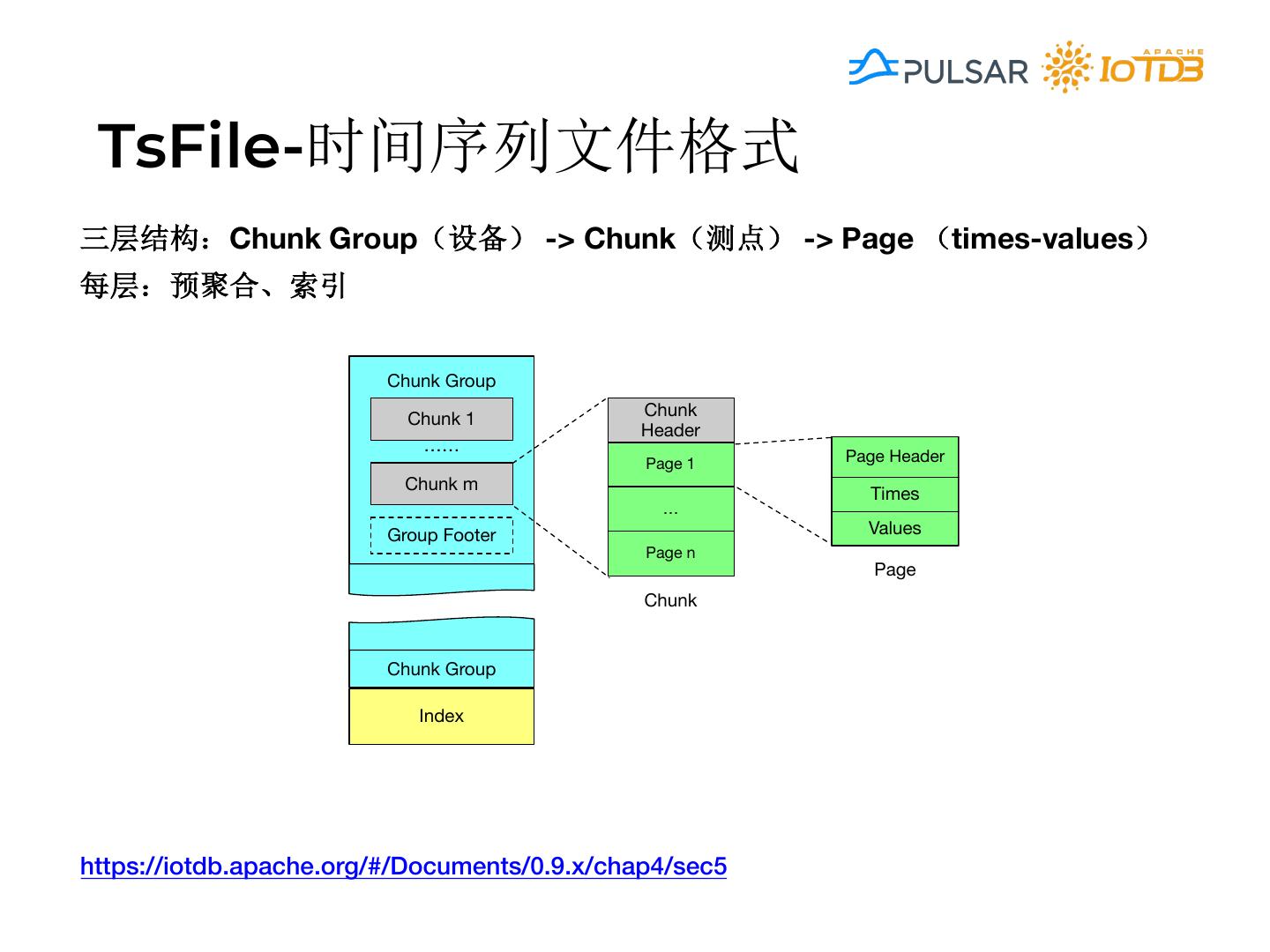 13 . TsFile-时间序列文件格式 三层结构:Chunk Group(设备) -> Chunk(测点) -> Page (times-values) 每层:预聚合、索引 Chunk Group Chunk 1 Chunk Header …… Page 1 Page Header Chunk m Times … Group Footer Values Page n Page Chunk Chunk Group Index https://iotdb.apache.org/#/Documents/0.9.x/chap4/sec5