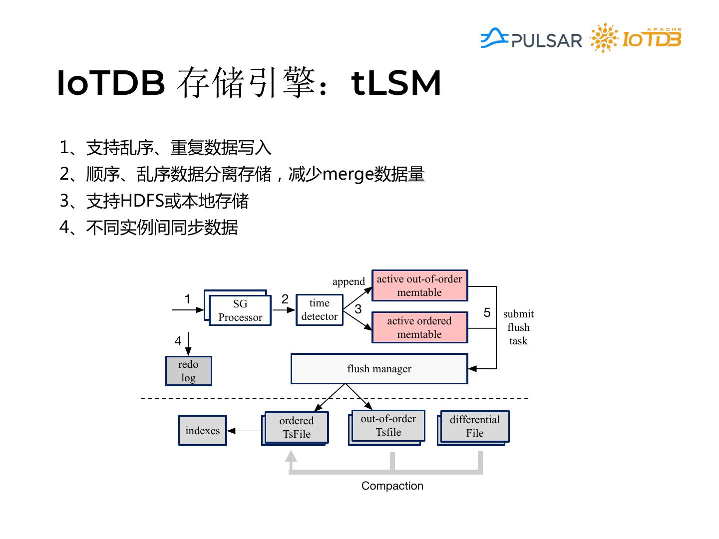 16 .IoTDB 存储引擎:tLSM 1、支持乱序、重复数据写入 2、顺序、乱序数据分离存储,减少merge数据量 3、支持HDFS或本地存储 4、不同实例间同步数据 append active out-of-order memtable 1 SG 2 time 3 5 submit Processor detector active ordered flush memtable 4 task redo flush manager log ordered out-of-order differential indexes TsFile Tsfile File Compaction