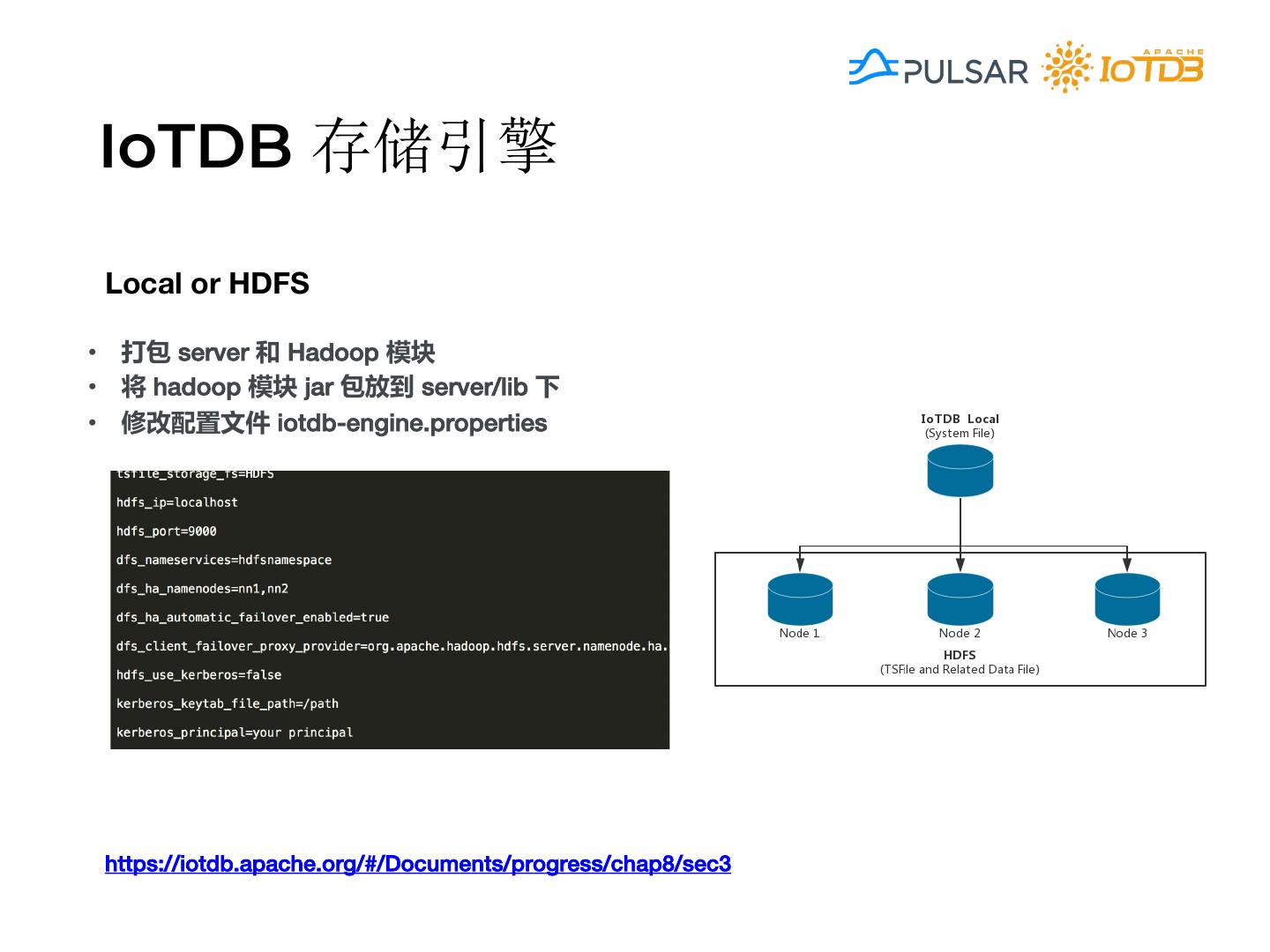17 . IoTDB 存储引擎 Local or HDFS • 打包 server 和 Hadoop 模块 • 将 hadoop 模块 jar 包放到 server/lib 下 • 修改配置文件 iotdb-engine.properties https://iotdb.apache.org/#/Documents/progress/chap8/sec3