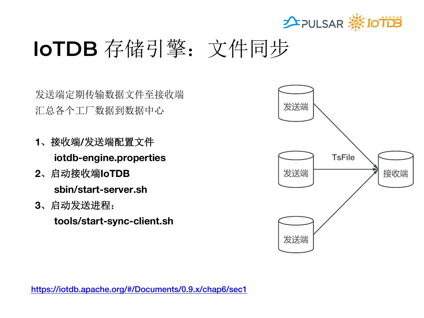 18 .IoTDB 存储引擎:文件同步 发送端定期传输数据文件至接收端 发送端 汇总各个工厂数据到数据中心 1、接收端/发送端配置文件 iotdb-engine.properties TsFile 2、启动接收端IoTDB 发送端 接收端 sbin/start-server.sh 3、启动发送进程: tools/start-sync-client.sh 发送端 https://iotdb.apache.org/#/Documents/0.9.x/chap6/sec1