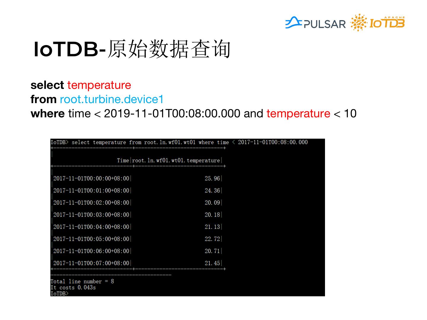 21 .IoTDB-原始数据查询 select temperature from root.turbine.device1 where time < 2019-11-01T00:08:00.000 and temperature < 10