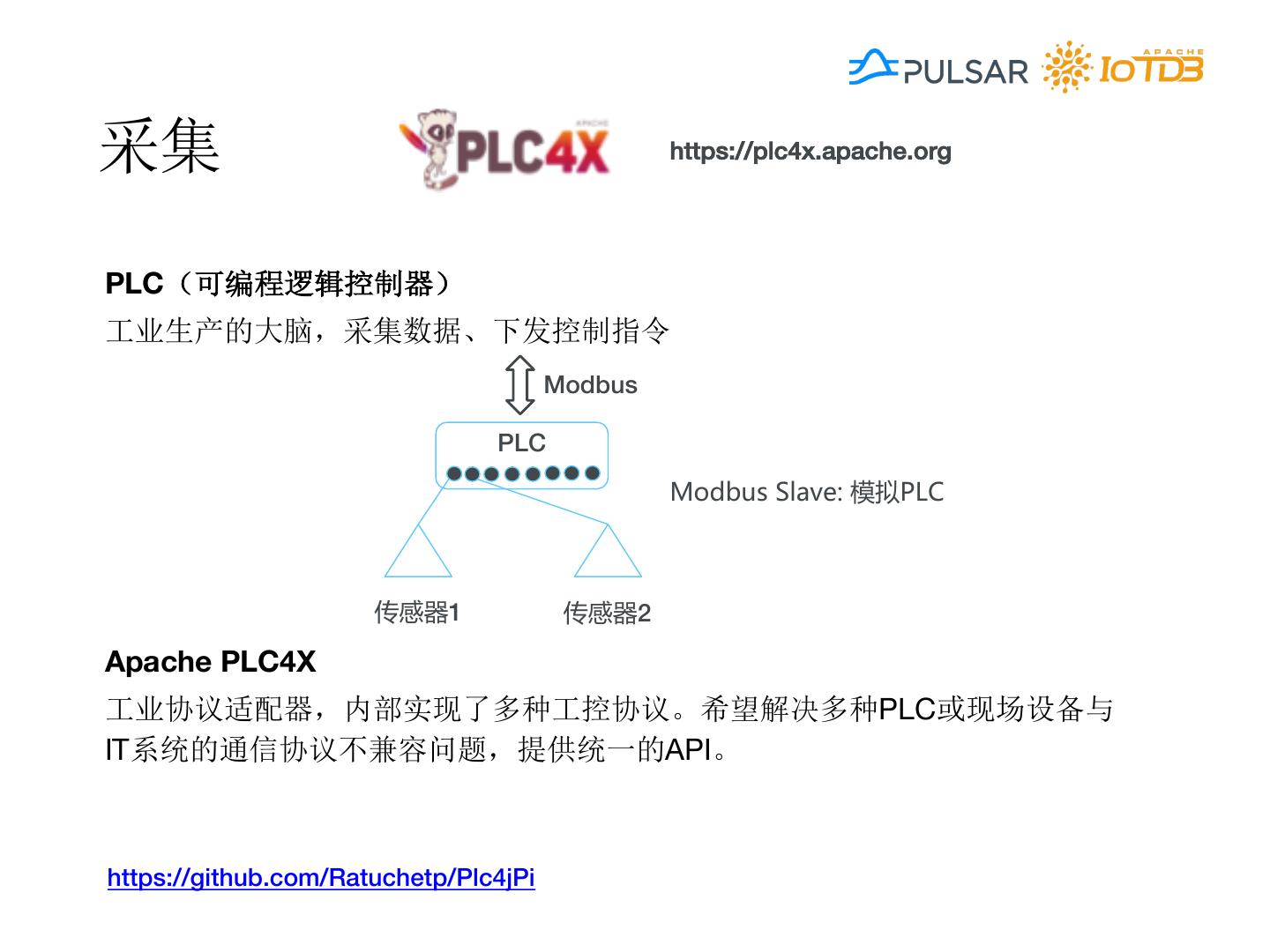 28 .采集 https://plc4x.apache.org PLC(可编程逻辑控制器) 工业生产的大脑,采集数据、下发控制指令 Modbus PLC Modbus Slave: 模拟PLC 传感器1 传感器2 Apache PLC4X 工业协议适配器,内部实现了多种工控协议。希望解决多种PLC或现场设备与 IT系统的通信协议不兼容问题,提供统一的API。 https://github.com/Ratuchetp/Plc4jPi