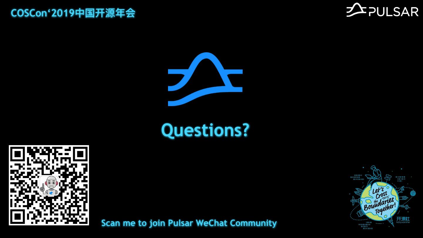 23 .COSCon‘2019中国开源年会 Apache Pulsar Conferences worldwide • 2019-11: Flink Forward Asia | Beijing (upcoming) • 2019-11: KubeCon North America | San Diego (upcoming) • 2019-10: Flink Forward Europe | Berlin (sponsor) • 2019-09: Apsara Conference | Hangzhou • 2019-09: Strata Data Conference | New York • 2019-09: ApacheCon North America | Las Vegas • 2019-08: World Artificial intelligence Conference | Shanghai • 2019-07: CSDI summit | Shenzhen • 2019-06: GIAC | Shenzhen