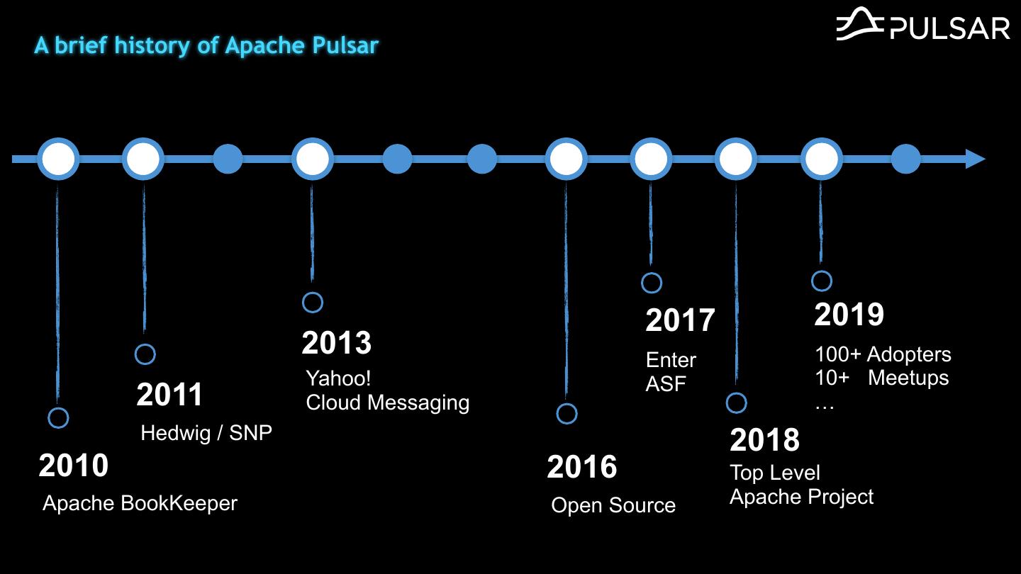 4 .A brief history of Apache Pulsar 2017 2019 2013 Enter 100+ Adopters Yahoo! ASF 10+ Meetups 2011 Cloud Messaging … Hedwig / SNP 2018 2010 2016 Top Level Apache BookKeeper Open Source Apache Project