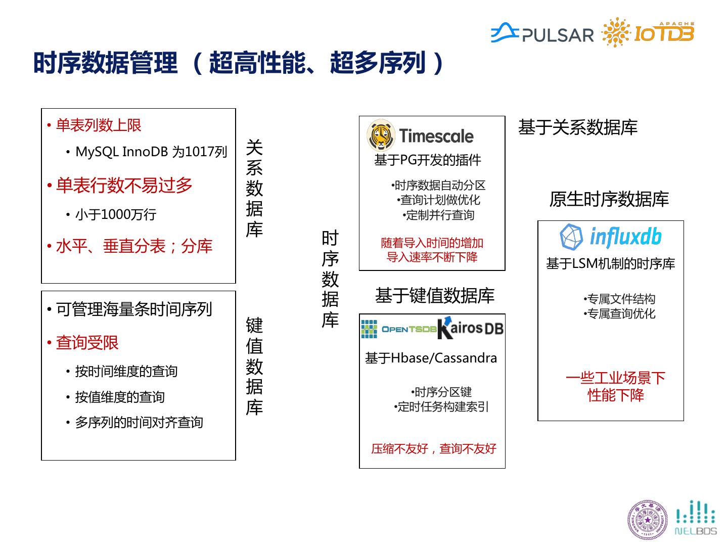 12 .时序数据管理 (超高性能、超多序列) • 单表列数上限 基于关系数据库 • MySQL InnoDB 为1017列 关 基于PG开发的插件 系 • 单表行数不易过多 数 •时序数据自动分区 •查询计划做优化 原生时序数据库 • 小于1000万行 据 •定制并行查询 库 • 水平、垂直分表;分库 时 随着导入时间的增加 序 导入速率不断下降 基于LSM机制的时序库 数 据 基于键值数据库 •专属文件结构 • 可管理海量条时间序列 •专属查询优化 键 库 • 查询受限 值 基于Hbase/Cassandra • 按时间维度的查询 数 一些工业场景下 据 •时序分区键 性能下降 • 按值维度的查询 库 •定时任务构建索引 • 多序列的时间对齐查询 压缩不友好,查询不友好