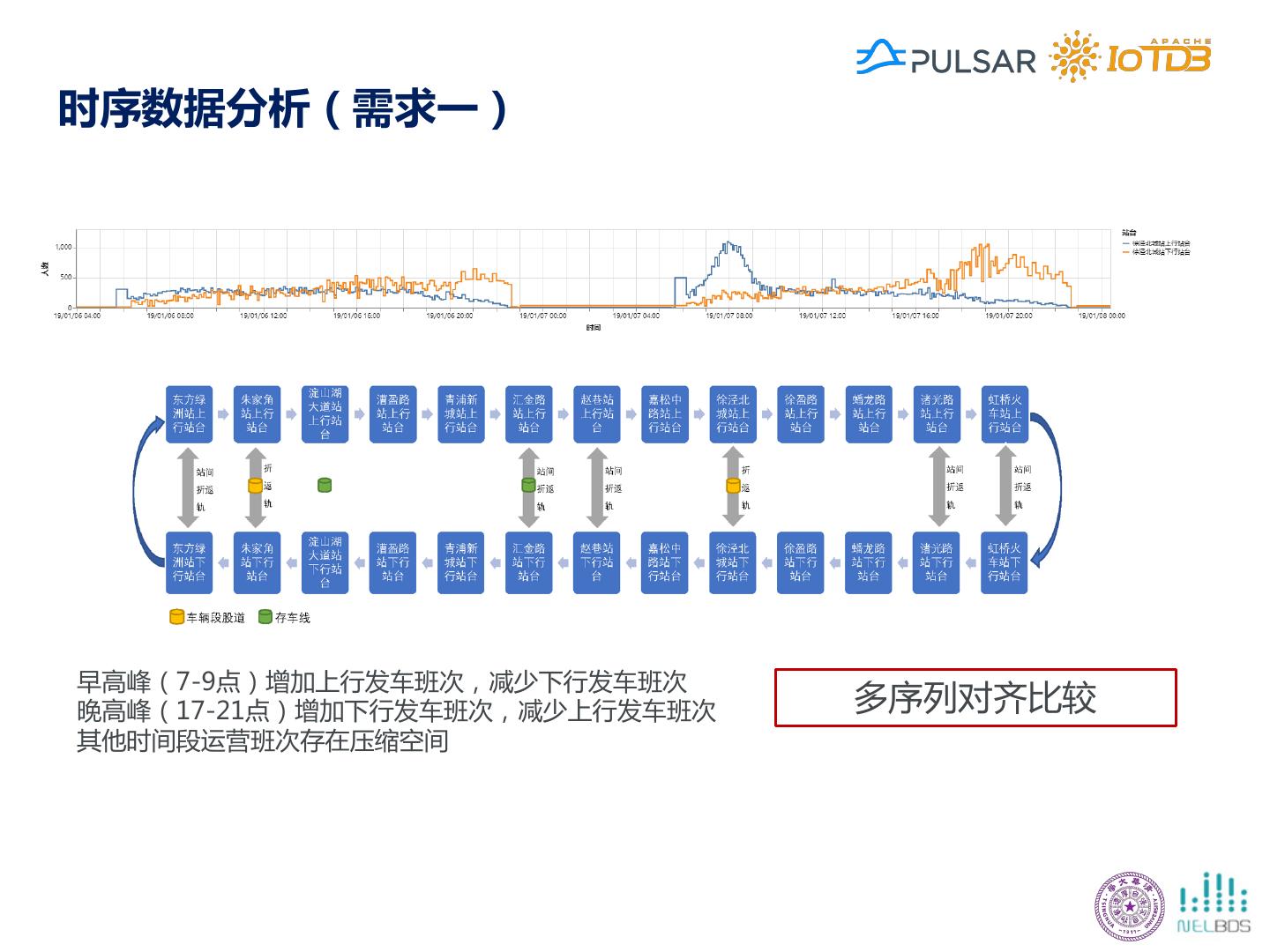 13 .时序数据分析(需求一) 早高峰(7-9点)增加上行发车班次,减少下行发车班次 晚高峰(17-21点)增加下行发车班次,减少上行发车班次 多序列对齐比较 其他时间段运营班次存在压缩空间
