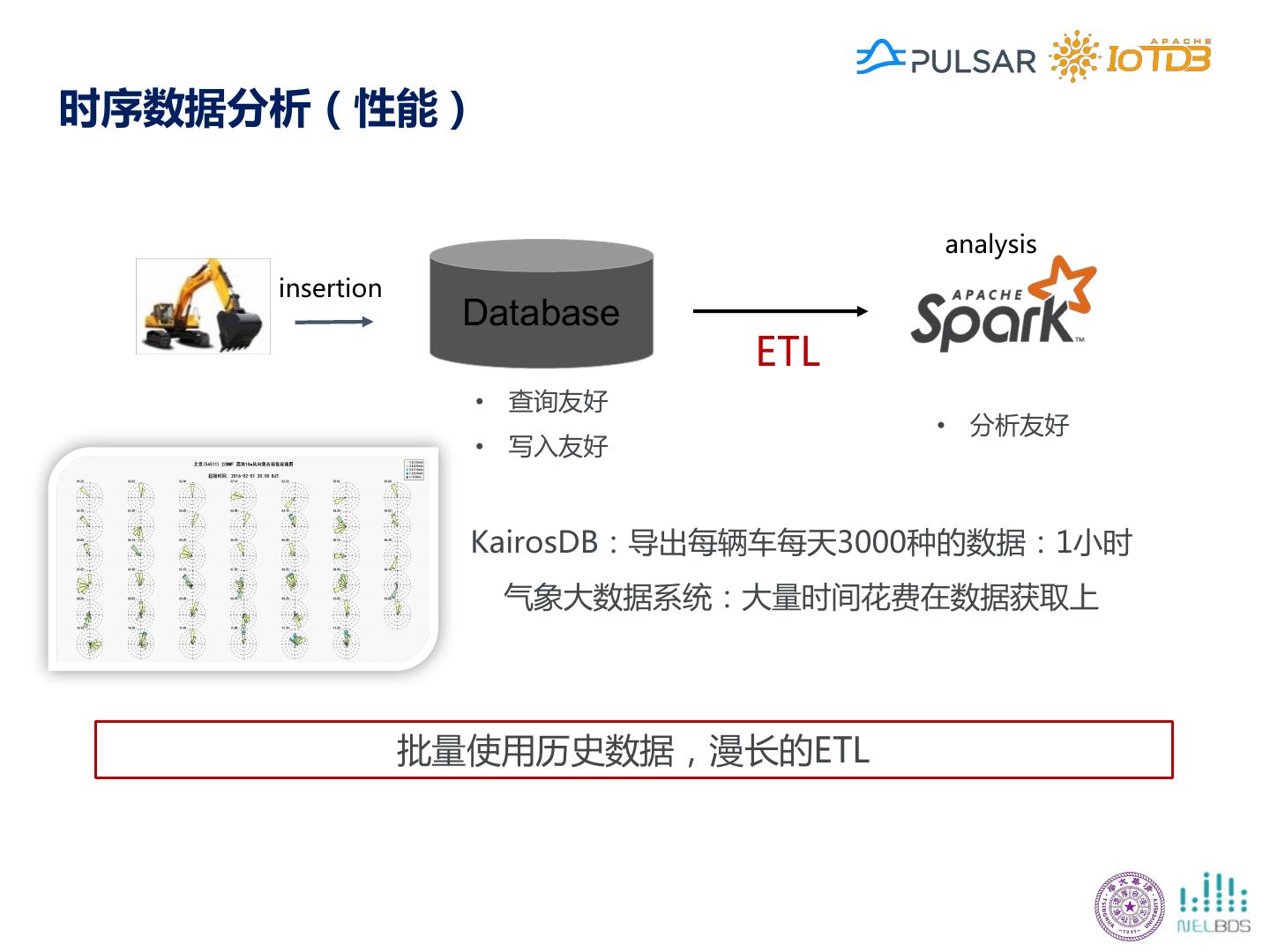 17 .时序数据分析(性能) analysis insertion Database ETL • 查询友好 • 分析友好 • 写入友好 KairosDB:导出每辆车每天3000种的数据:1小时 气象大数据系统:大量时间花费在数据获取上 批量使用历史数据,漫长的ETL