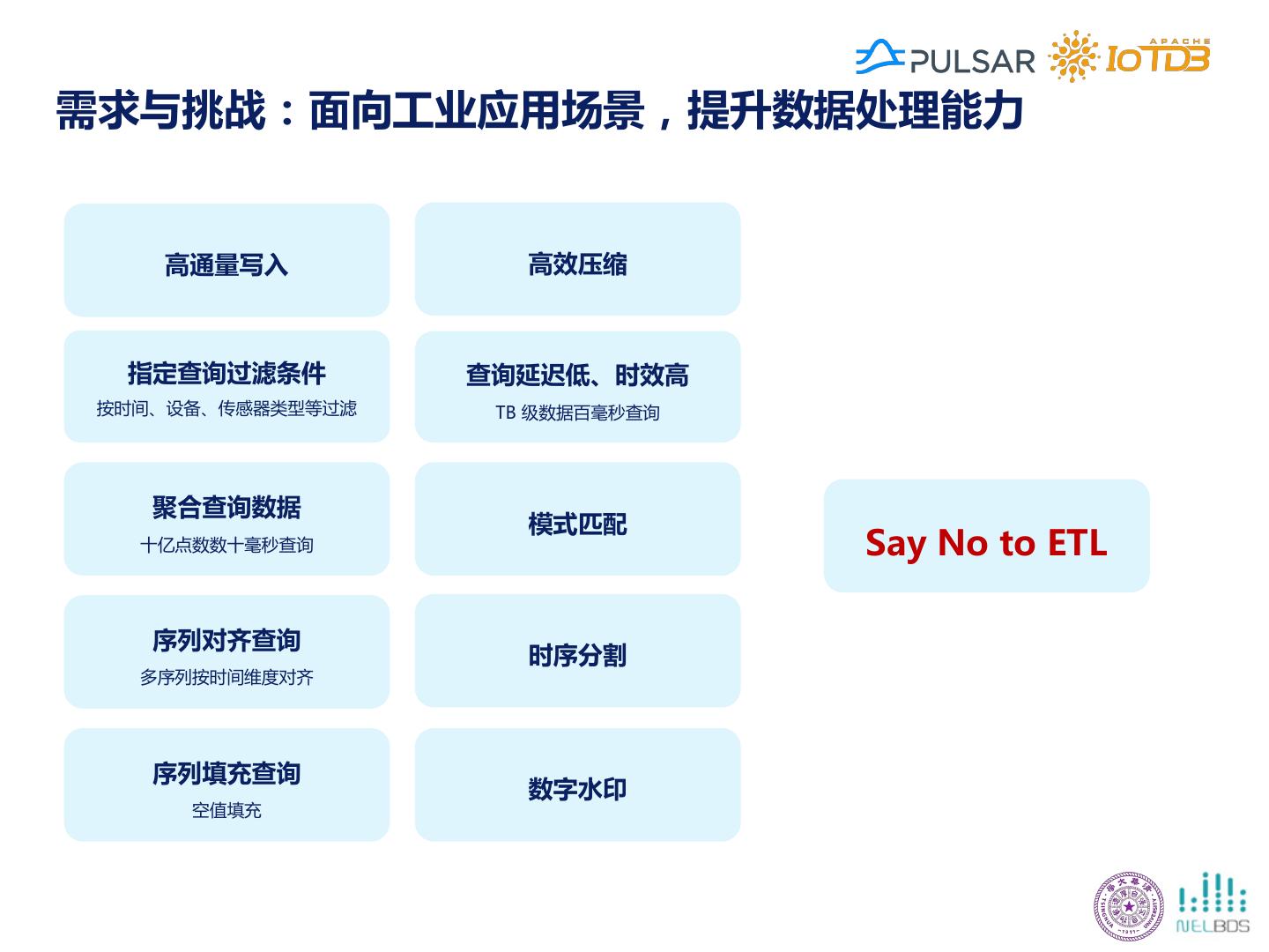 18 .需求与挑战:面向工业应用场景,提升数据处理能力 高通量写入 高效压缩 指定查询过滤条件 查询延迟低、时效高 按时间、设备、传感器类型等过滤 TB 级数据百毫秒查询 聚合查询数据 模式匹配 十亿点数数十毫秒查询 Say No to ETL 序列对齐查询 时序分割 多序列按时间维度对齐 序列填充查询 数字水印 空值填充