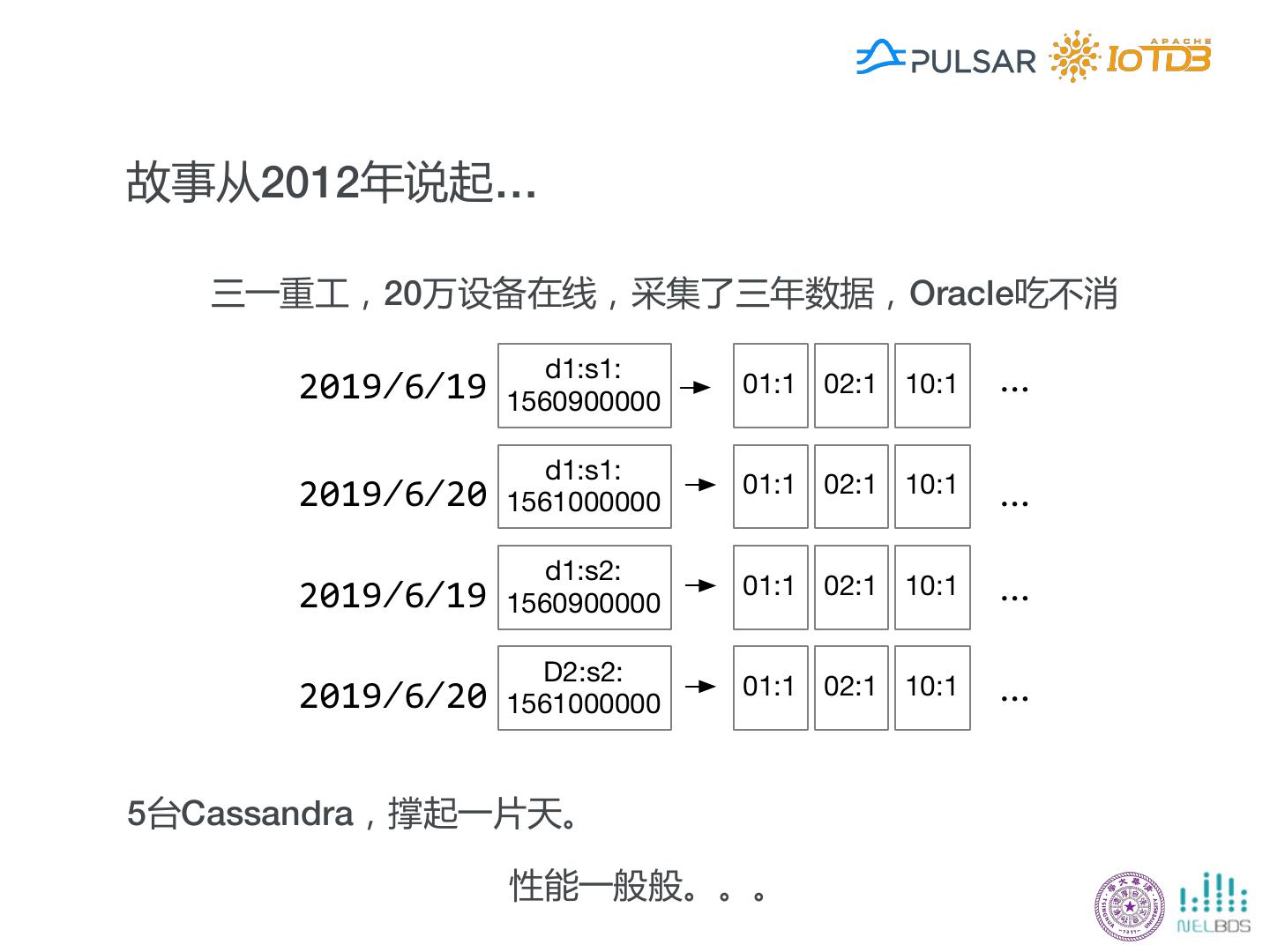 20 .故事从2012年说起… 三一重工,20万设备在线,采集了三年数据,Oracle吃不消 2019/6/19 d1:s1: 01:1 02:1 10:1 … 1560900000 d1:s1: 2019/6/20 1561000000 01:1 02:1 10:1 … d1:s2: 2019/6/19 1560900000 01:1 02:1 10:1 … D2:s2: 2019/6/20 1561000000 01:1 02:1 10:1 … 5台Cassandra,撑起一片天。 性能一般般。。。