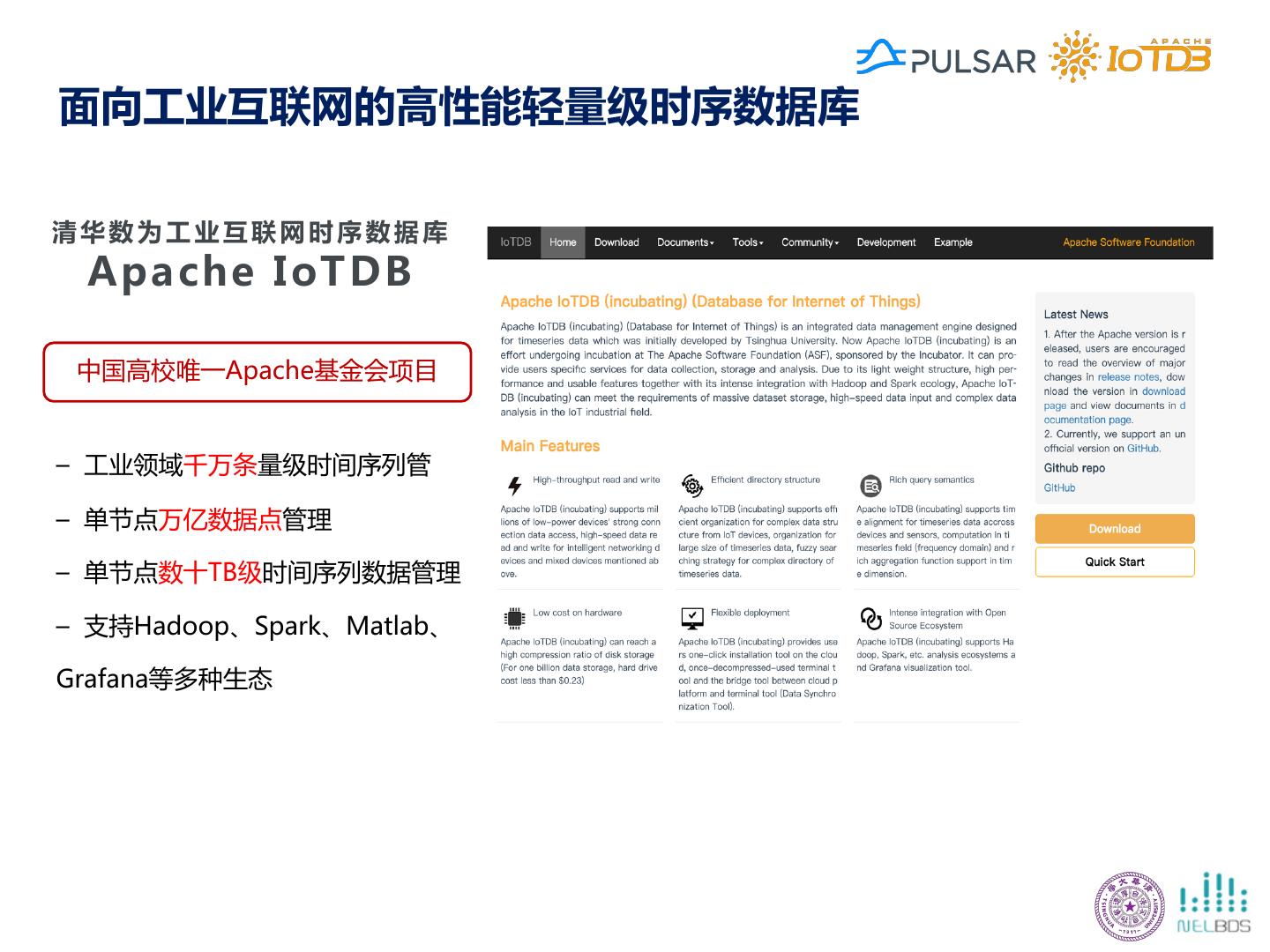 23 .面向工业互联网的高性能轻量级时序数据库 清华数为工业互联网时序数据库 Apache IoTDB 中国高校唯一Apache基金会项目 – 工业领域千万条量级时间序列管 – 单节点万亿数据点管理 – 单节点数十TB级时间序列数据管理 – 支持Hadoop、Spark、Matlab、 Grafana等多种生态