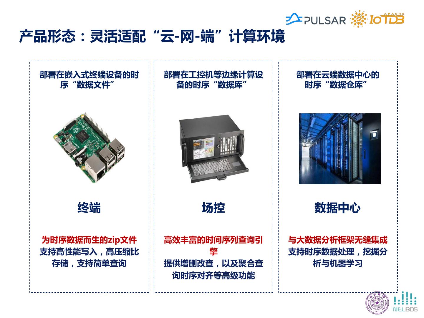 25 .产品形态:灵活适配“云-网-端”计算环境 部署在嵌入式终端设备的时 部署在工控机等边缘计算设 部署在云端数据中心的 序“数据文件” 备的时序“数据库” 时序“数据仓库” 终端 场控 数据中心 为时序数据而生的zip文件 高效丰富的时间序列查询引 与大数据分析框架无缝集成 支持高性能写入,高压缩比 擎 支持时序数据处理,挖掘分 存储,支持简单查询 提供增删改查,以及聚合查 析与机器学习 询时序对齐等高级功能