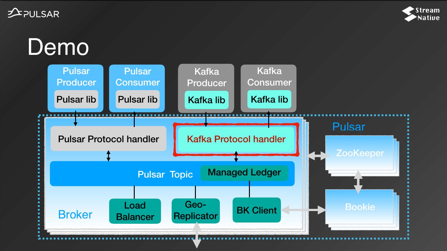 25 .Demo Pulsar Pulsar Kafka Kafka Producer Consumer Producer Consumer Pulsar lib Pulsar lib Kafka lib Kafka lib Pulsar Pulsar Protocol handler Kafka Protocol handler ZooKeeper Pulsar Topic Managed Ledger Load Geo- Bookie BK Client Broker Balancer Replicator
