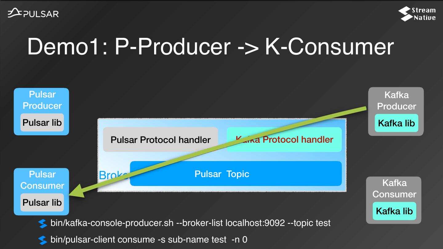 27 . Demo1: P-Producer -> K-Consumer Pulsar Kafka Producer Producer Pulsar lib Kafka lib Pulsar Protocol handler Kafka Protocol handler Pulsar Broker Pulsar Topic Consumer Kafka Consumer Pulsar lib Kafka lib bin/pulsar-client produce test -n 1 -m “Hello from Pulsar Producer, Message 1” bin/kafka-console-consumer.sh --bootstrap-server localhost:9092 --topic test --from-beginning