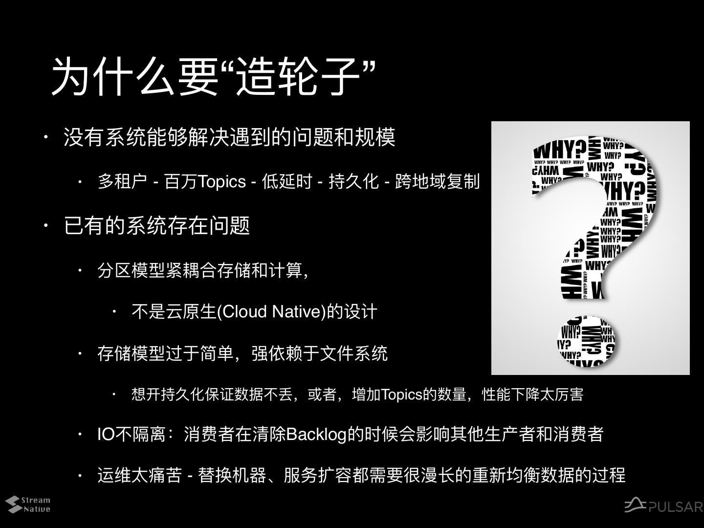 6 . 为什么要“造轮⼦” • 没有系统能够解决遇到的问题和规模 • 多租户 - 百万Topics - 低延时 - 持久化 - 跨地域复制 • 已有的系统存在问题 • 分区模型紧耦合存储和计算, • 不是云原⽣(Cloud Native)的设计 • 存储模型过于简单,强依赖于⽂件系统 • 想开持久化保证数据不丢,或者,增加Topics的数量,性能下降太厉害 • IO不隔离:消费者在清除Backlog的时候会影响其他⽣产者和消费者 • 运维太痛苦 - 替换机器、服务扩容都需要很漫⻓的重新均衡数据的过程