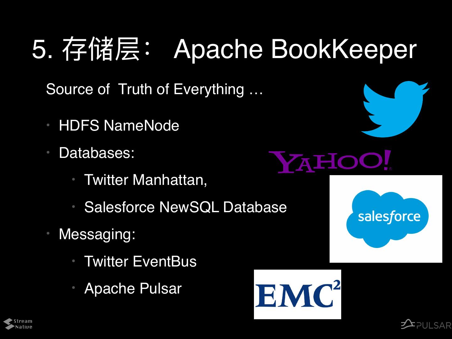 18 .5. 存储层: Apache BookKeeper Source of Truth of Everything … • HDFS NameNode • Databases: • Twitter Manhattan, • Salesforce NewSQL Database • Messaging: • Twitter EventBus • Apache Pulsar