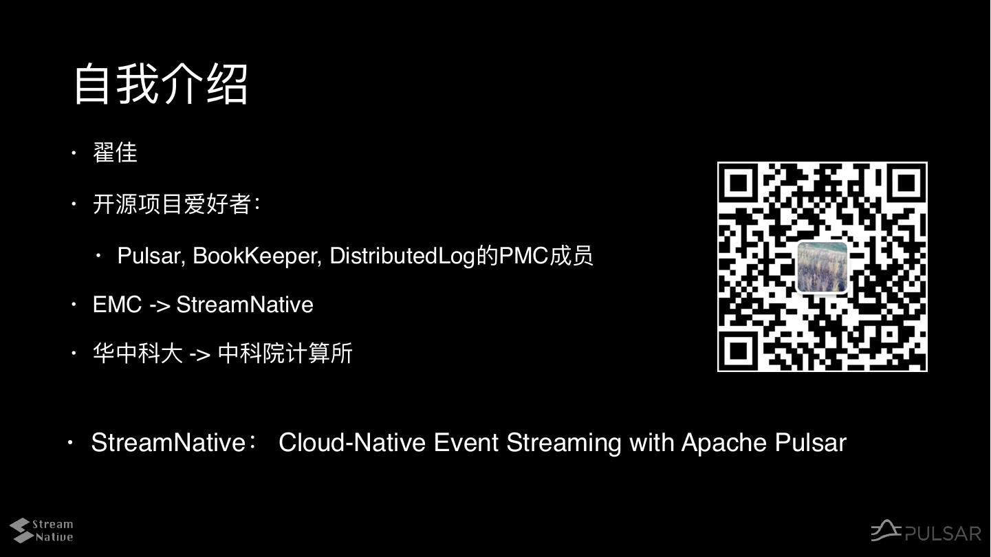 3 .⾃自我介绍 • 翟佳 • 开源项⽬目爱好者: • Pulsar, BookKeeper, DistributedLog的PMC成员 • EMC -> StreamNative • 华中科⼤大 -> 中科院计算所 • StreamNative: Cloud-Native Event Streaming with Apache Pulsar