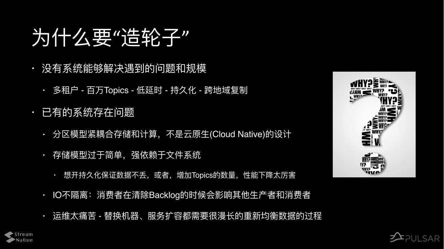 6 .为什什么要“造轮⼦子” • 没有系统能够解决遇到的问题和规模 • 多租户 - 百万Topics - 低延时 - 持久化 - 跨地域复制 • 已有的系统存在问题 • 分区模型紧耦合存储和计算,不不是云原⽣生(Cloud Native)的设计 • 存储模型过于简单,强依赖于⽂文件系统 • 想开持久化保证数据不不丢,或者,增加Topics的数量量,性能下降太厉害 • IO不不隔离:消费者在清除Backlog的时候会影响其他⽣生产者和消费者 • 运维太痛苦 - 替换机器器、服务扩容都需要很漫⻓长的重新均衡数据的过程