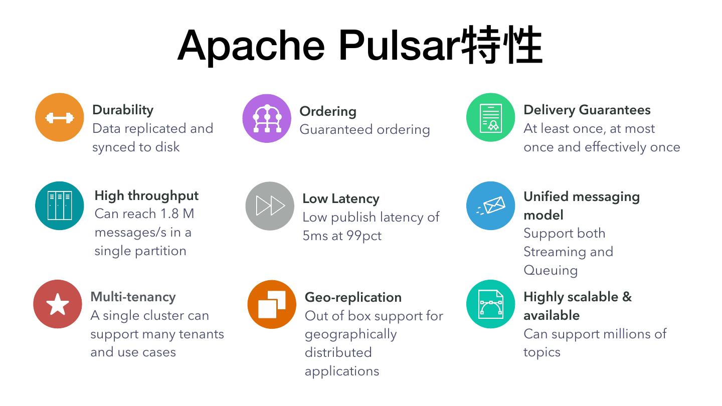 2 . Apache Pulsar特性 Durability Ordering Delivery Guarantees Data replicated and Guaranteed ordering At least once, at most synced to disk once and effectively once High throughput Low Latency Unified messaging Can reach 1.8 M Low publish latency of model messages/s in a 5ms at 99pct Support both single partition Streaming and Queuing Multi-tenancy Geo-replication Highly scalable & A single cluster can Out of box support for available support many tenants geographically Can support millions of and use cases distributed topics applications