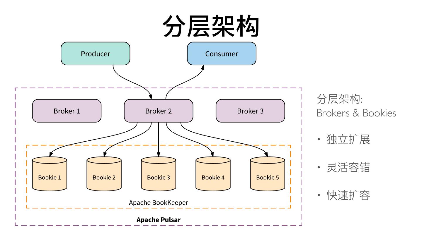 3 .分层架构 分层架构: Brokers & Bookies • 独⽴立扩展 • 灵活容错 • 快速扩容