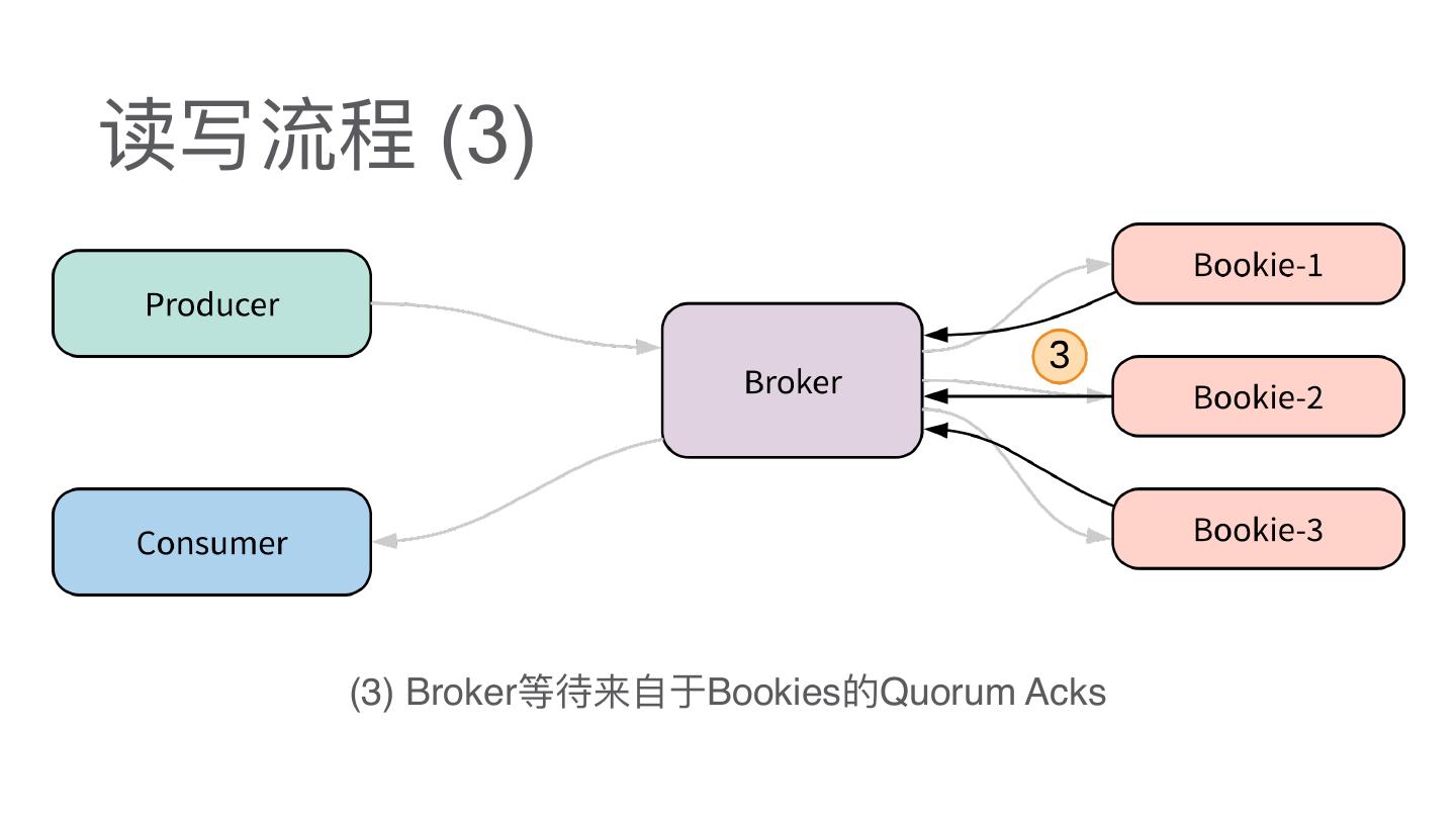 8 .读写流程 (3) (3) Broker等待来⾃自于Bookies的Quorum Acks