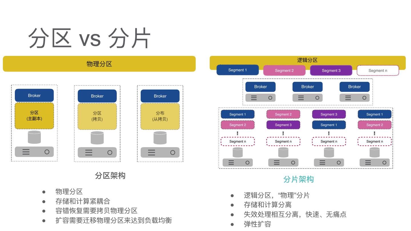 14 .分区 vs 分⽚片 逻辑分区 物理理分区 Segment 1 Segment 2 Segment 3 Segment n Broker Broker Broker Broker Broker Broker 分区 分区 分布 Segment 1 Segment 2 Segment 3 Segment 1 (主副本) (拷⻉贝) (从拷⻉贝) Segment 2 Segment 3 Segment 1 Segment 2 . . . . . . . . Segment n Segment n Segment n Segment n 分区架构 分⽚片架构 ! 物理理分区 ! 逻辑分区,“物理理”分⽚片 ! 存储和计算紧耦合 ! 存储和计算分离 ! 容错恢复需要拷⻉贝物理理分区 ! 失效处理理相互分离,快速、⽆无痛点 ! 扩容需要迁移物理理分区来达到负载均衡 ! 弹性扩容