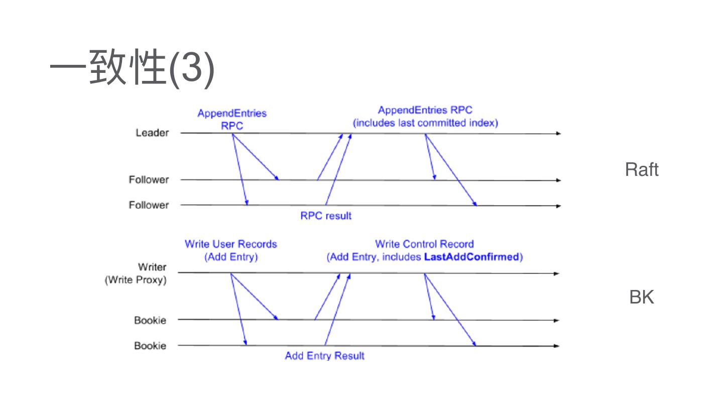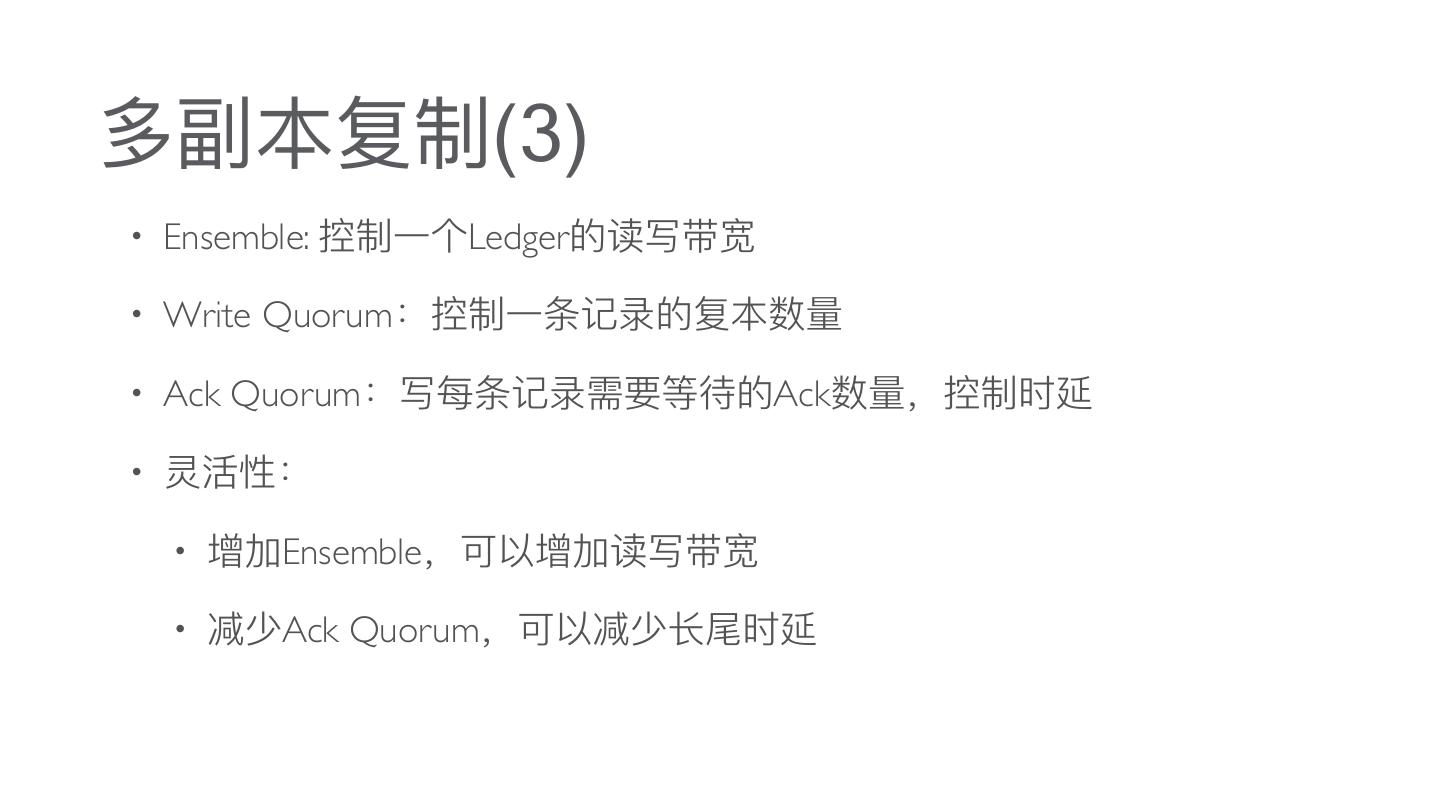 20 .多副本复制(3) • Ensemble: 控制⼀一个Ledger的读写带宽 • Write Quorum:控制⼀一条记录的复本数量量 • Ack Quorum:写每条记录需要等待的Ack数量量,控制时延 • 灵活性: • 增加Ensemble,可以增加读写带宽 • 减少Ack Quorum,可以减少⻓长尾时延